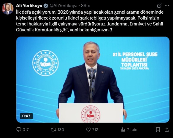 İçişleri Bakanı Ali Yerlikaya, polis, jandarma ve sahil güvenlik gibi bakanlığın üç kolluğunda görev yapan personelin hak ve ücret dengesine yönelik önemli açıklamalarda bulundu. Bakan Yerlikaya, 2026 yılı genel atama döneminde kişiselleştirilecek zorunlu ikinci şark tebligatının artık yapılmayacağını duyurdu.