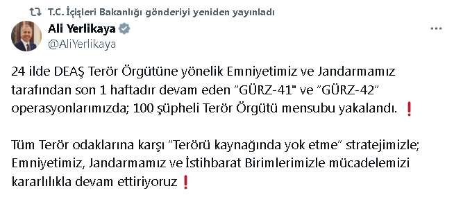 Bakan Yerlikaya, sosyal medya hesabından yaptığı açıklamada, Cumhuriyet başsavcılıkları, Emniyet Genel Müdürlüğü Terörle Mücadele (TEM) Daire Başkanlığı ve İstihbarat Başkanlığı ile Jandarma Genel Komutanlığı TEM Daire Başkanlığı koordinasyonunda; 24 ilde DEAŞ terör örgütüne yönelik son 1 haftadır devam eden 'Gürz-41' ve 'Gürz-42' operasyonlarında 100 şüphelinin yakalandığını belirtti. Operasyonlar sonucu çok sayıda örgütsel doküman ve dijital materyal ele geçirildiğini aktaran Yerlikaya, "Şüphelilerin DEAŞ terör örgütü içerisinde faaliyet gösterdikleri, terör örgütüne finans sağladıkları ve sosyal medya hesapları üzerinden DEAŞ terör örgütünün propagandası yaptıkları tespit edildi" ifadelerini kullandı.Cumhuriyet başsavcılıkları ile polis ve jandarmayı tebrik eden Yerlikaya, "Tüm terör odaklarına karşı terörü kaynağında yok etme stratejimizle; emniyetimiz, jandarmamız ve istihbarat birimlerimizle mücadelemizi kararlılıkla devam ettiriyoruz" dedi.