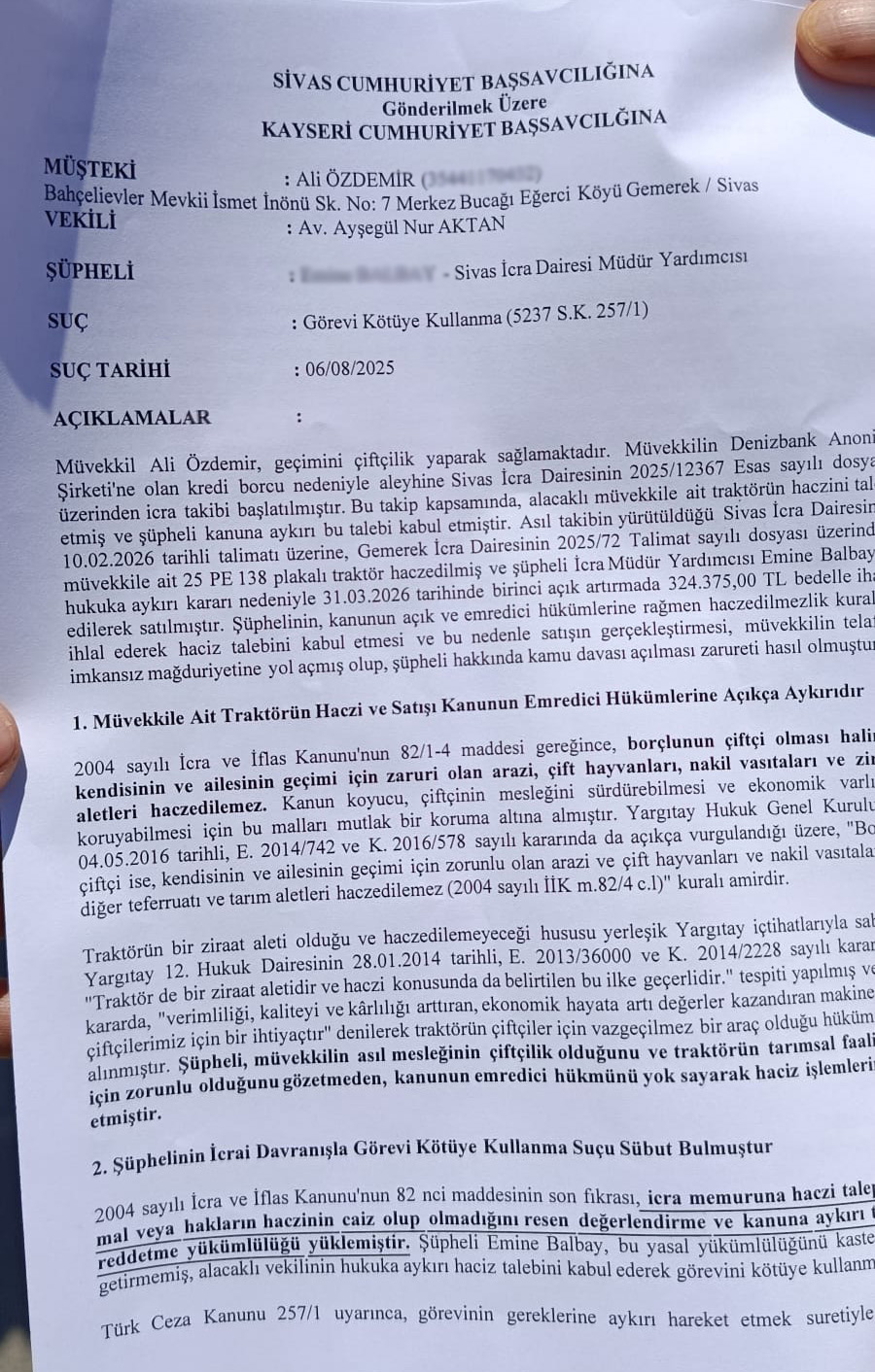 Kayseri Adliyesi önünde bir araya gelen Tüketiciler Birliği Genel Başkanı Mahmut Şahin, traktörü haciz edilen Sivaslı çiftçi Ali Özdemir ve avukatı ile birlikte, hukuka aykırı işlem yaptığı iddia edilen icra müdür yardımcısı hakkında suç duyurusunda bulundu. Şahin, 96 yıldır yürürlükte olan "çiftçinin traktörü haciz edilemez" kanununun çiğnendiğini belirterek sert açıklamalarda bulundu.