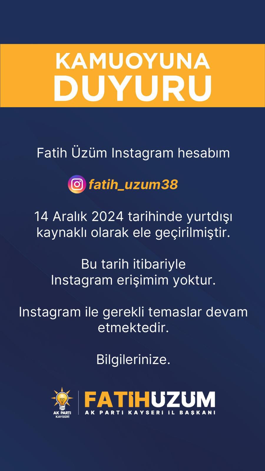 "Fatih Üzüm Instagram hesabım fatih_uzum38, 14 Aralık 2024 tarihinde yurtdışı kaynaklı bir saldırı sonucu ele geçirilmiştir. Bu tarihten itibaren Instagram’a erişim sağlayamıyorum. Hesabımı geri almak için Instagram yetkilileriyle temaslarımız sürmektedir. Kamuoyuna saygıyla duyurulur."