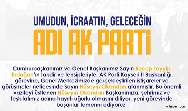 Cumhurbaşkanı ve AK Parti Genel Başkanı Recep Tayyip Erdoğan’ın onayıyla, AK Parti Kayseri İl Başkanlığı görevine Hüseyin Okandan getirildi. Fatih Üzüm’den devralan Okandan, yeni görevinde başarılar dilerken, teşkilatın birlik ve beraberlik içinde hareket edeceği vurgulandı.