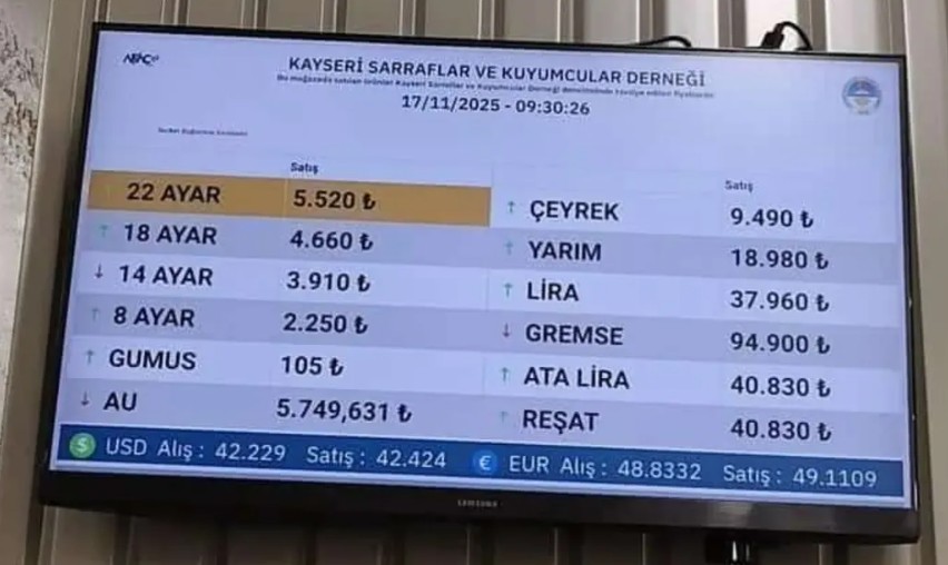 Kayseri Sarraf ve Kuyumcular Derneği’nden alınan bilgilere göre 17 Kasım Pazartesi (bugün) fiyat listesi şu şekilde;22 Ayar (Gram Altın): 5570,00 TL 18 Ayar: 4700,00 TL
