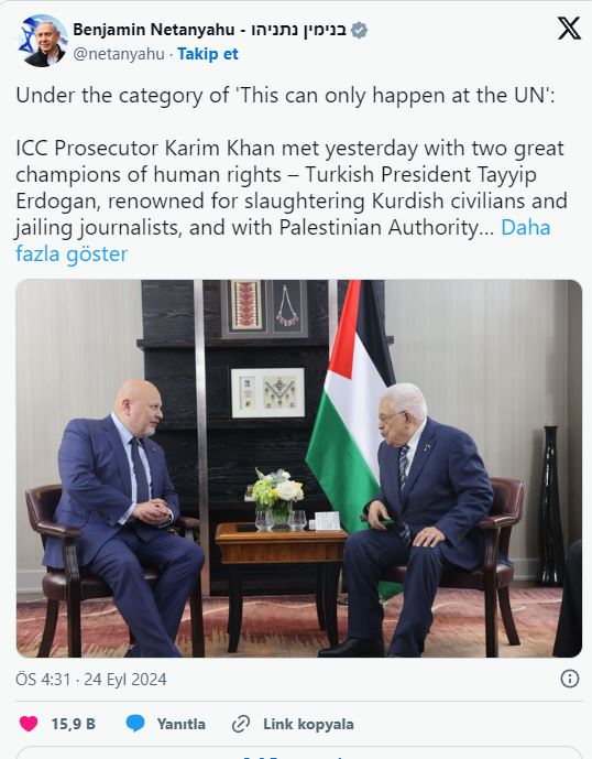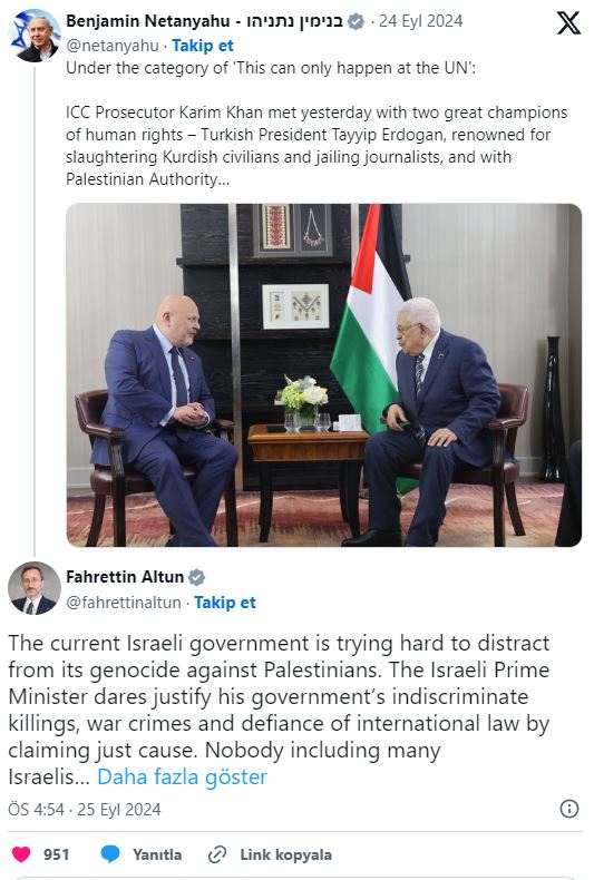 İletişim Başkanı Fahrettin Altun, İsrail Başbakanı Binyamin Netanyahu'nun Uluslararası Ceza Mahkemesi (UCM) Başsavcısı Karim Khan’ın Filistin Devlet Başkanı Mahmut Abbas ve Türkiye Cumhurbaşkanı Recep Tayyip Erdoğan ile yaptığı görüşmelere dair yaptığı açıklamalara sert bir yanıt verdi. Altun, sosyal medya hesabından yaptığı açıklamada, Netanyahu’nun Filistin’e yönelik İsrail saldırılarını haklı çıkarmaya çalıştığını ve uluslararası hukuku hiçe saydığını ifade etti.