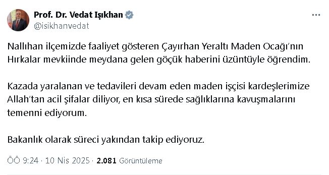 Çalışma ve Sosyal Güvenlik Bakanı Vedat Işıkhan, sosyal medya hesabından yaptığı açıklamada, "Nallıhan ilçemizde faaliyet gösteren Çayırhan Yeraltı Maden Ocağı'nın Hırkalar mevkisinde meydana gelen göçük haberini üzüntüyle öğrendim. Kazada yaralanan ve tedavileri devam eden maden işçisi kardeşlerimize Allah'tan acil şifalar diliyor, en kısa sürede sağlıklarına kavuşmalarını temenni ediyorum. Bakanlık olarak süreci yakından takip ediyoruz" ifadelerini kullandı.
