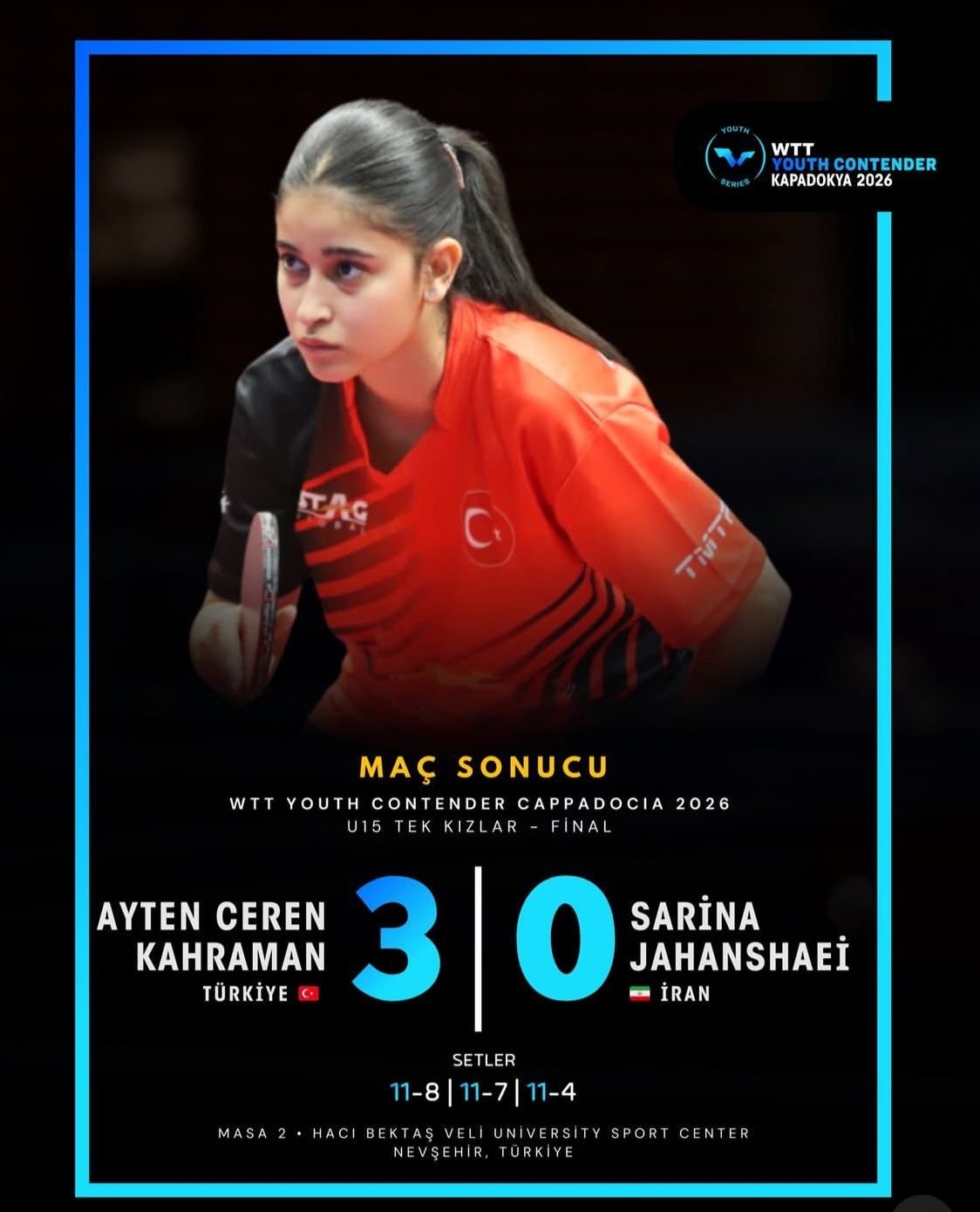 Kayseri’nin Kocasinan ilçesini ve Türkiye’yi uluslararası arenada temsil eden Kocasinan Belediyesi Spor Kulübü Masa Tenisi Milli Sporcusu Ayten Ceren Kahraman, Kapadokya’da düzenlenen WTT Youth Contender Kapadokya 2026 Uluslararası Turnuvası’nda önemli bir başarı elde etti. 28–31 Ocak 2026 tarihleri arasında gerçekleştirilen organizasyonda mücadele eden genç sporcu, U15 Tek Kızlar finalinde İranlı rakibi Sarina Jahanshaei’yi 3-0 mağlup ederek şampiyon oldu.