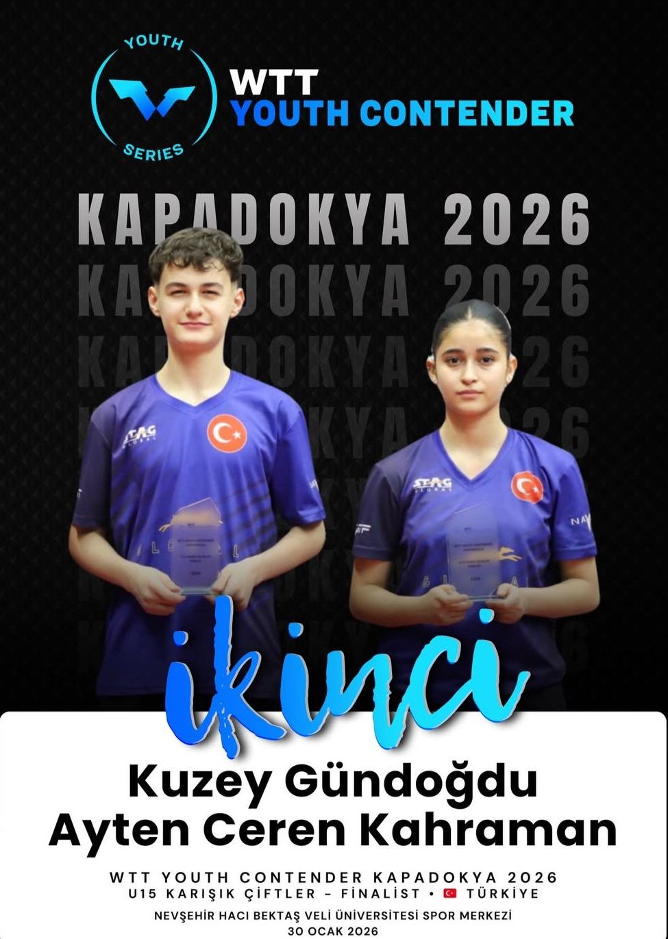 Ayten Ceren Kahraman, Kapadokya’daki başarısını yalnızca tekler kategorisiyle sınırlı bırakmadı. U15 Karışık Çiftler kategorisinde partneri Kuzey Gündoğdu ile birlikte mücadele eden Kahraman, bu kategoride ikincilik elde ederek gümüş madalyanın sahibi oldu.