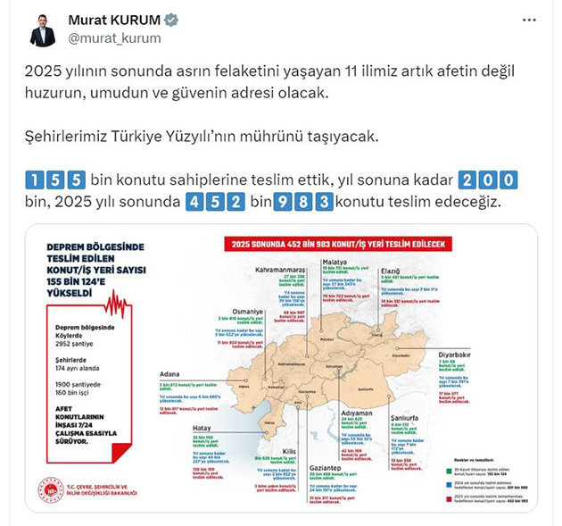 Bakan Kurum, sosyal medya hesabından yaptığı açıklamada, "2025 yılının sonunda asrın felaketini yaşayan 11 ilimiz artık afetin değil huzurun, umudun ve güvenin adresi olacak. Şehirlerimiz Türkiye Yüzyılı'nın mührünü taşıyacak. 155 bin konutu sahiplerine teslim ettik, yıl sonuna kadar 200 bin, 2025 yılı sonunda 452 bin 983 konutu teslim edeceğiz" dedi.