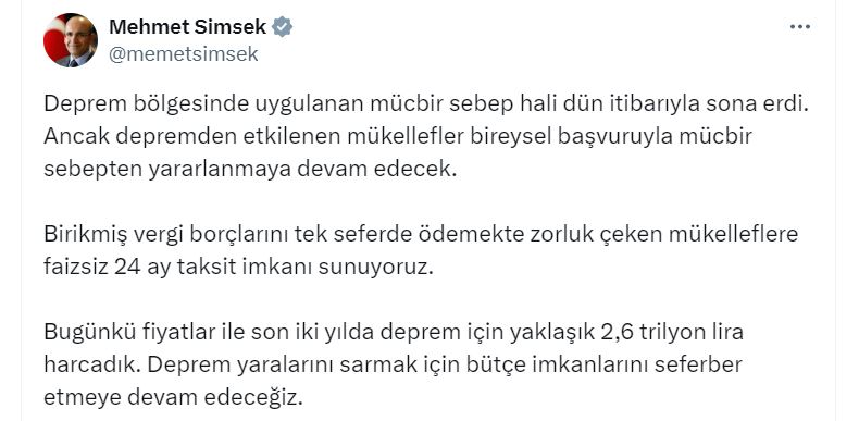Hazine ve Maliye Bakanı Mehmet Şimşek, sosyal medya üzerinden yaptığı açıklamalarda, Türkiye'nin son iki yılda karşılaştığı büyük depremlere yönelik yapılan harcamalar hakkında önemli bilgiler paylaştı. Bakan Şimşek, bugünkü fiyatlarla, depremin yol açtığı zararları telafi etmek için yaklaşık 2,6 trilyon lira harcandığını belirtti. Bu rakamın, Türkiye'nin deprem sonrası gösterdiği dayanışma ve devletin, depremzedelere yönelik yardım için yaptığı büyük bütçe seferberliğini yansıttığı ifade ediliyor.Bakan Şimşek, deprem bölgesinde uygulanan "mücbir sebep hali"nin dün itibarıyla sona erdiğini açıkladı. Ancak, depremden etkilenen mükelleflerin, bu süreçte bireysel başvurularla mücbir sebepten yararlanmaya devam edebileceklerini duyurdu. Bu açıklama, depremzedelerin ekonomik açıdan daha fazla yük altına girmemeleri için önemli bir adım olarak değerlendiriliyor.