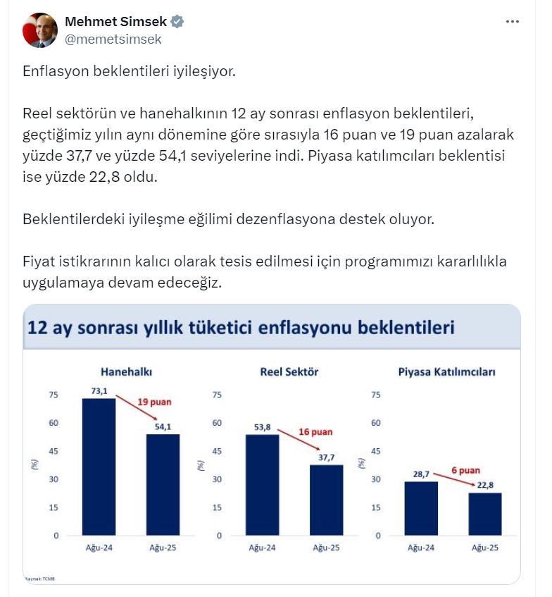 Bakan Şimşek, Türkiye Cumhuriyet Merkez Bankası’nın (TCMB) Ağustos 2025 dönemi sektörel enflasyon beklentilerine ilişkin değerlendirmelerde bulundu. Sosyal medya hesabından yaptığı açıklamada, reel sektör ve hanehalkının 12 ay sonrası enflasyon beklentilerinde geçen yılın aynı dönemine göre önemli düşüşler yaşandığını kaydetti.