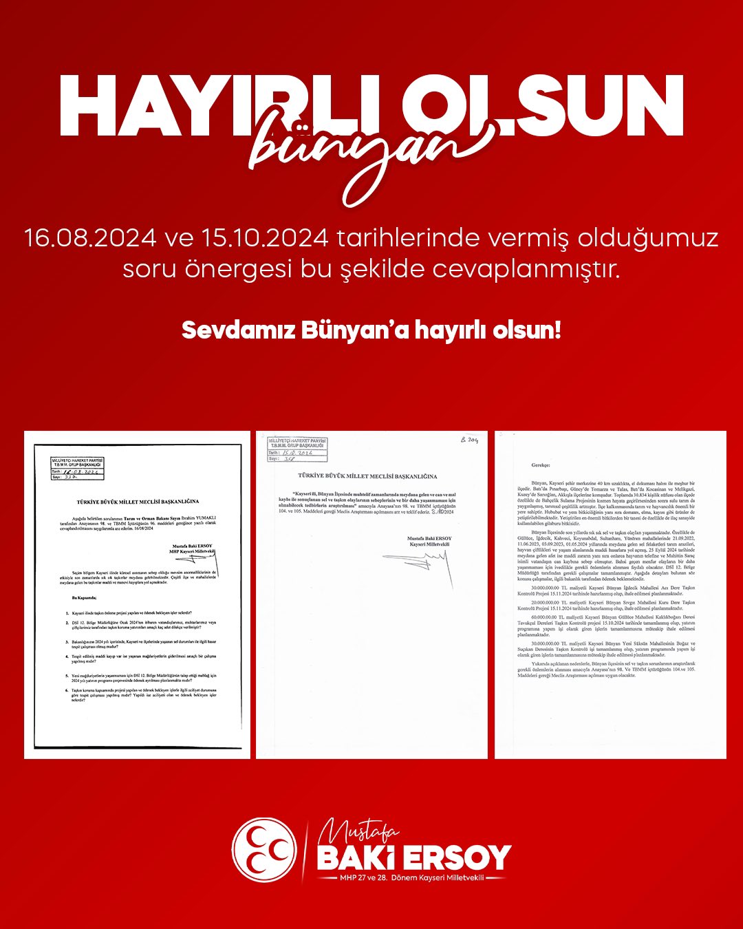 “Hayırlı Olsun Bünyan; 16.08.2024 - 15.10.2024 tarihlerinde vermiş olduğumuz önergelerimiz neticesinde ilgili Bakanlık tarafından, Bünyan ilçemizdeki dere ıslah çalışmaları için ödenek çıkartılmıştır. Sevdamız Bünyan’a hayırlı olsun.”