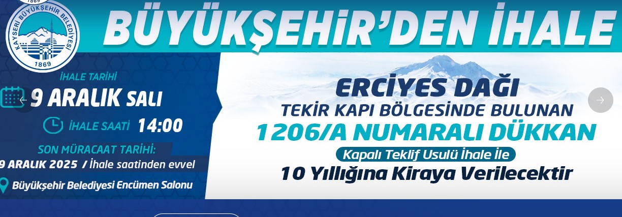 Büyükşehir Belediyesi, Erciyes Dağı Tekir Kapı bölgesinde yer alan 1206/A numaralı dükkanı kapalı teklif usulüyle 10 yıllığına kiraya verecek. İhale, 9 Aralık 2025 Salı günü saat 14.00’te Büyükşehir Belediyesi Encümen Salonu’nda yapılacak.