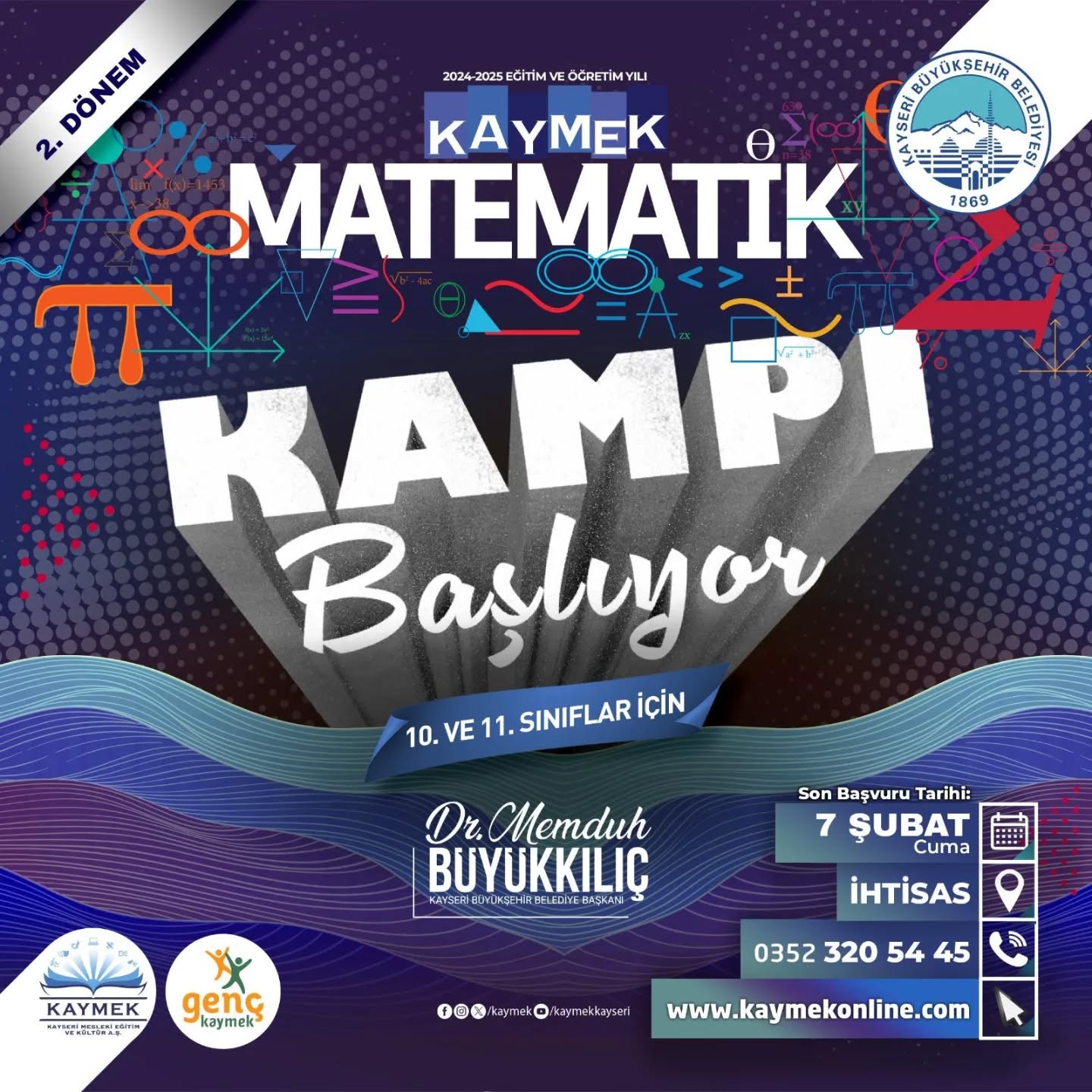 Kayseri Büyükşehir Belediyesi bünyesinde faaliyet gösteren Kayseri Mesleki Eğitim ve Kültür A.Ş. (KAYMEK), eğitim ve kültür sanat alanındaki başarılı projelerine bir yenisini daha ekliyor. 2024-2025 eğitim-öğretim döneminde yoğun ilgi gören Matematik Kampı’nın 1. döneminin ardından, 2. dönem kayıtları başladı.Matematik Kampı, öğrencilerin matematiksel yeteneklerini geliştirmek, analitik düşünme becerilerini artırmak ve motivasyonlarını üst seviyeye taşımak amacıyla düzenleniyor. 10. ve 11. sınıf öğrencilerine ücretsiz olarak sunulan bu atölye, alanında uzman eğitmenlerin rehberliğinde gerçekleştirilecek.Kamp süresince öğrenciler, matematiksel dikkat ve zekâ kazanımlarını artıracak dersler alacak, analitik düşünme ve problem çözme yeteneklerini geliştirecek. Ayrıca, matematik ve motivasyon derslerinin yanı sıra farklı branşlarda da etkinlikler düzenlenecek.