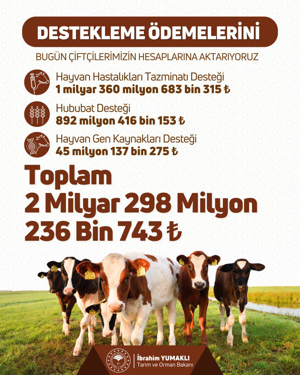 2 milyar 298 milyon 236 bin TL destekleme ödemesini bugün çiftçilerimizin hesaplarına aktarıyoruz.
