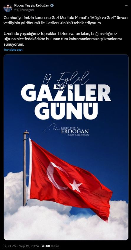 Cumhurbaşkanı Recep Tayyip Erdoğan, 19 Eylül Gaziler Günü sebebiyle sosyal medya hesabı üzerinden bir açıklama yaptı. Erdoğan, mesajında Cumhuriyet’in kurucusu Gazi Mustafa Kemal Atatürk'e "Müşir ve Gazi" unvanı verilişinin yıl dönümünü hatırlatarak, tüm gazilerin Gaziler Günü’nü kutladı. Paylaşımında Erdoğan, "Üzerinde yaşadığımız toprakları bizlere vatan kılan, bağımsızlığımız uğruna nice fedakârlıkta bulunan tüm kahramanlarımıza şükranlarımı sunuyorum" ifadelerini kullandı. Bu anlamlı gün vesilesiyle, gazilere ve şehitlere minnet duygularını dile getirdi.