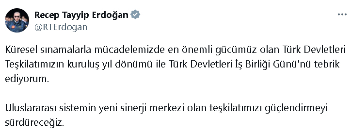 Cumhurbaşkanı Erdoğan, sosyal medya hesabından yaptığı açıklamada, "Küresel sınamalarla mücadelemizde en önemli gücümüz olan Türk Devletleri Teşkilatımızın kuruluş yıl dönümü ile Türk Devletleri İş Birliği Günü'nü tebrik ediyorum.