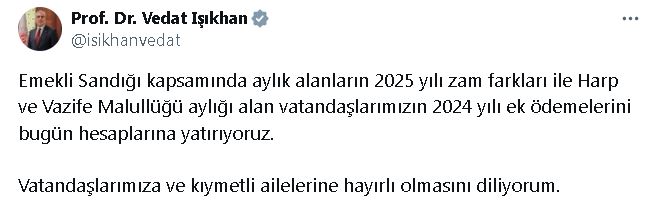 Bakan Işıkhan, sosyal medya hesabından yaptığı açıklamada, "Emekli Sandığı kapsamında aylık alanların, 2025 yılı zam farkları ile Harp ve Vazife Malullüğü Aylığı alan vatandaşlarımızın 2024 yılı ek ödemelerini bugün hesaplarına yatırıyoruz. Vatandaşlarımıza ve kıymetli ailelerine hayırlı olmasını diliyorum" dedi.Işıkhan, Emekli Sandığı kapsamında aylık alan 2 milyon 486 bin 870 kişiye toplam 8 milyar 125 milyon TL zam farkı ile Harp ve Vazife Malullüğü Aylığı alan veya hak sahibi 58 bin 644 kişiye toplam 1 milyar 339 milyon TL ek ödemenin bugün aktarılacağını açıkladı.