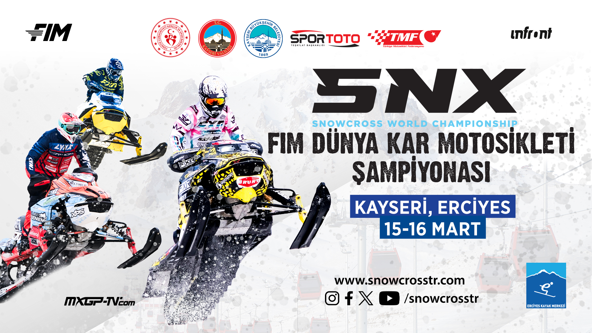 Kayseri Büyükşehir Belediye Başkanı Dr. Memduh Büyükkılıç, 15-16 Mart 2025 tarihlerinde Erciyes Kayak Merkezi’nde düzenlenecek olan 2025 FIM Dünya Kar Motosikleti Şampiyonası’na tüm sporseverleri davet etti. Şampiyona, Erciyes'in ikinci kez ev sahipliği yapacağı dünya çapında büyük bir organizasyon olma özelliğini taşıyor. Kayseri’nin en büyük kayak merkezi olan Erciyes, aynı zamanda motor sporları tutkunlarının buluşma noktası haline geldi. Geçen yıl Türkiye'de ilk kez düzenlenen bu etkinlik, 850 milyon kişiye ulaşmışken, bu yıl 86 ülkede canlı yayınla izlenmesi bekleniyor.