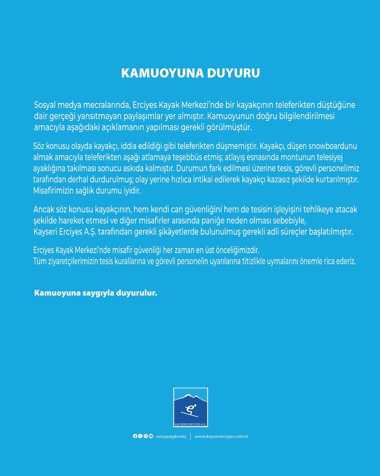 Tesis yetkilileri, misafirlerin güvenliği ve huzuru için kurallara uymanın önemine dikkat çekti. Kayseri Erciyes Kayak Merkezi, ziyaretçilerini tesis kurallarına ve görevli uyarılarına titizlikle uymaya çağırdı.