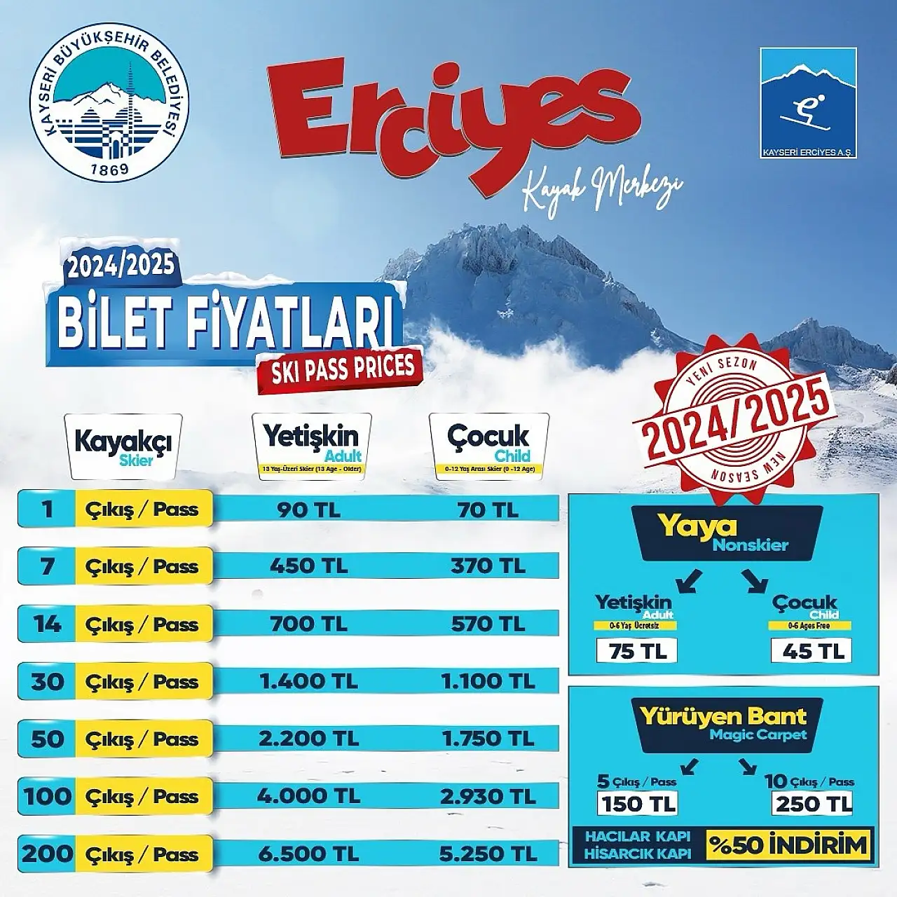 Kayseri Büyükşehir Belediyesi’ne bağlı Erciyes A.Ş. tarafından belirlenen 2024-2025 sezonu teleferik bilet fiyatları, geçtiğimiz sezona göre yüzde 50 oranında artırıldı. Buna göre;