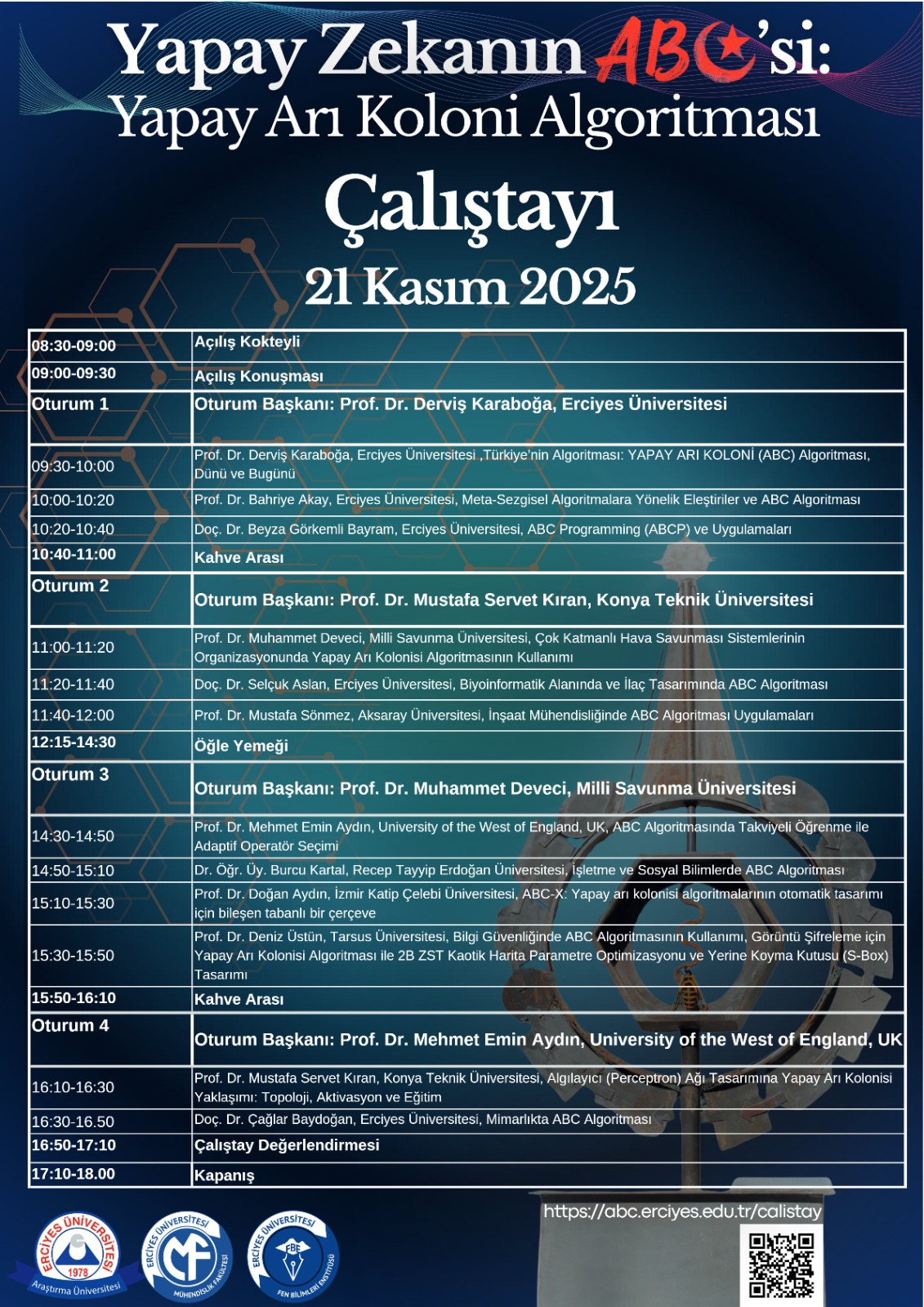 Erciyes Üniversitesi, yapay zekâ ve optimizasyon alanının en önemli bilimsel buluşmalarından biri olacak “Yapay Zekânın AB’si: Yapay Arı Koloni Algoritması Çalıştayı” için hazırlıklarını tamamladı. 21 Kasım 2025’te gerçekleştirilecek olan çalıştayda, ABC algoritmasının geliştirilmesinde öncü isimlerden Prof. Dr. Derviş Karaboğa’nın açılış konuşması yer alacak.Türkiye’nin Algoritması Sahneye Çıkacak08.30’da başlayacak olan açılış kokteylinin ardından düzenlenecek açılış konuşmasında Prof. Dr. Derviş Karaboğa, Türkiye’de geliştirilen Yapay Arı Kolonisi (ABC) algoritmasının dünyadaki yeri, dünü ve bugünü hakkında kapsamlı bilgiler paylaşacak.Günün ilk oturumunda Prof. Dr. Bahriye Akay ve Doç. Dr. Beyza Görkemli Bayram, ABC algoritmasının meta-sezgisel yöntemler içindeki konumunu ve programlama uygulamalarını ele alacak.Savunmadan Sağlığa: ABC’nin Genişleyen Etki AlanıProf. Dr. Mustafa Servet Kıran’ın yöneteceği ikinci oturumda, ABC algoritmasının savunma sanayinden biyoinformatiğe kadar farklı alanlardaki güncel kullanım alanları tartışılacak.