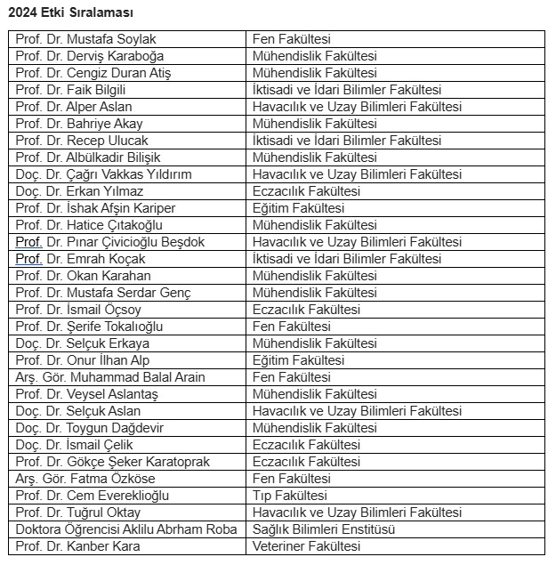 2024 Etki Sıralamasında Yer Alan Akademisyenlerden Bazıları: