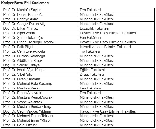 Aynı listede, “Kariyer Boyu Etki Sıralaması” kategorisinde de 26 ERÜ akademisyeni bulunuyor. Bu akademisyenlerden 2’si alanında ilk 100’e, 4’ü ilk 500’e ve 10’u ilk 1000’e girdi.