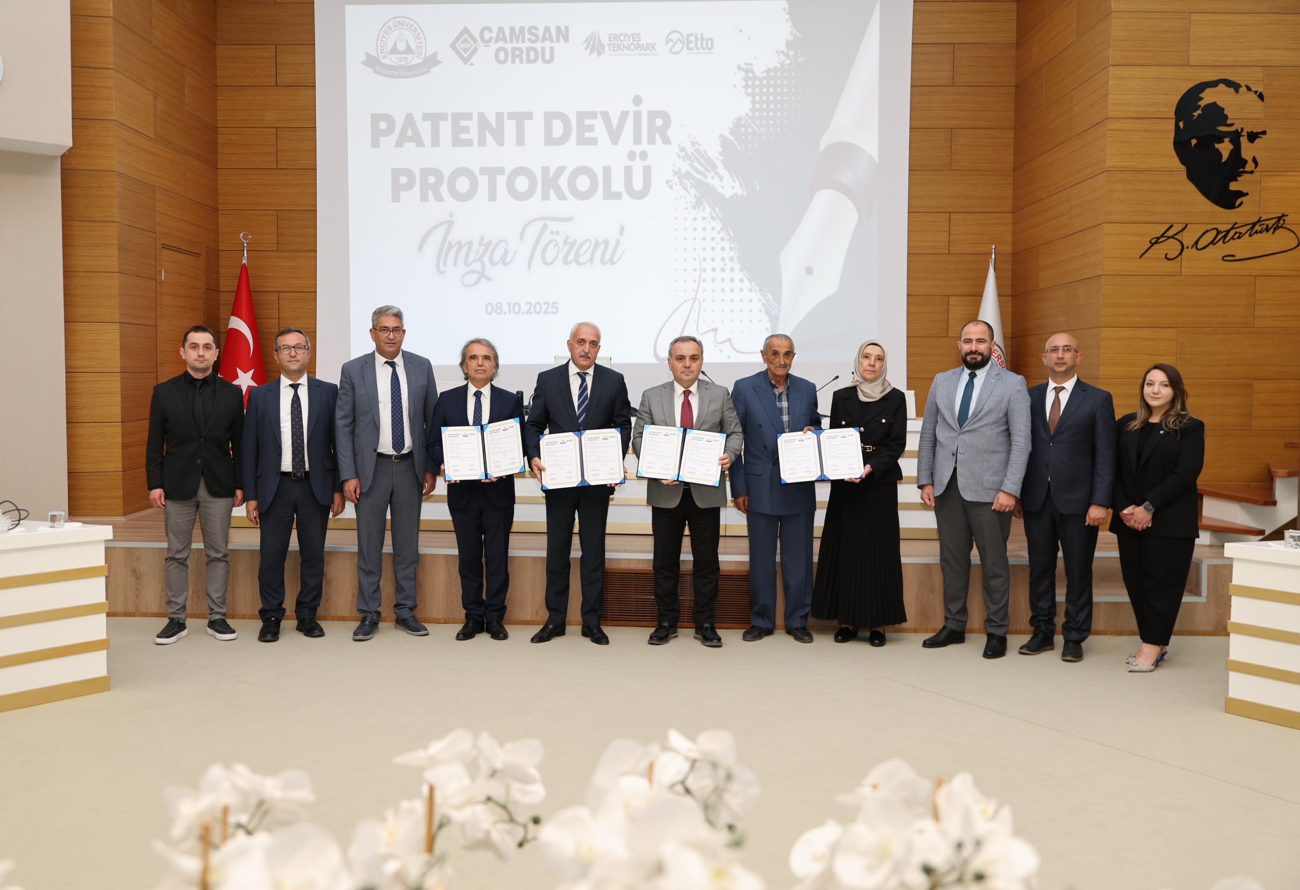 Konuşmaların ardından, ERÜ Rektörü Prof. Dr. Fatih Altun ile Çamsan Ordu A.Ş. Yönetim Kurulu Üyesi ve Başkan Vekili Sedat Aksakallı tarafından patent devir protokolü imzalandı.