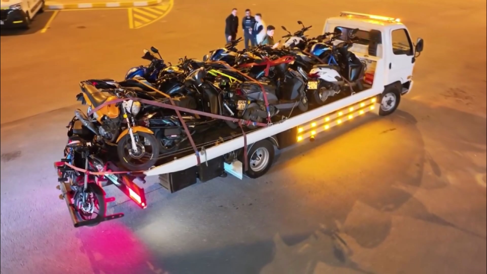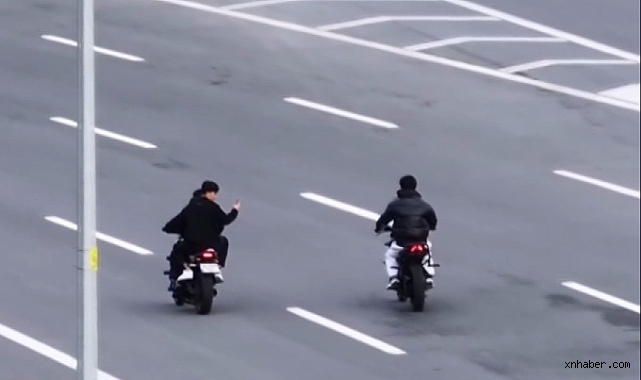 MOTOSİKLET SÜRÜCÜLERİNİN TEHLİKELİ HAREKETLERİ KAMERADAEmniyete çok sayıda ihbar gelmesine neden olan motosikletlilerin trafikte yaptığı tehlikeli hareketler kameraya yansıdı. Görüntülerde, motosikletli bir grubun ön tekerlerini kaldırıp tehlikeli hareketler yaptıkları, ardından çok sayıda polisin yolları kapattığı, polisi gören şüphelilerin ise kaçmaya çalıştığı görülüyor.