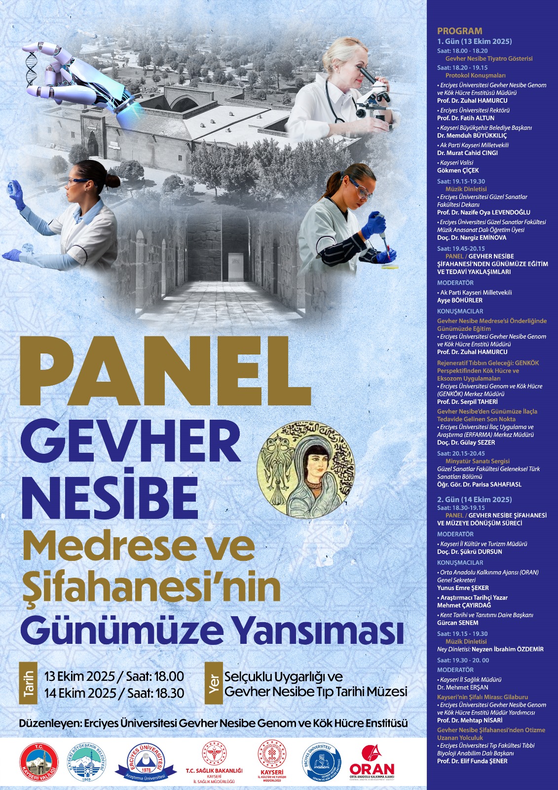 Panelin ilk günü saat 18.00’de “Gevher Nesibe” tiyatro gösterisi ile başlayacak. Açılış konuşmalarını Erciyes Üniversitesi Rektörü Prof. Dr. Fatih Altun, Kayseri Valisi Gökmen Çiçek, Kayseri Büyükşehir Belediye Başkanı Dr. Memduh Büyükkılıç, AK Parti Kayseri Milletvekili Dr. Murat Cahid Cıngı ve Erciyes Üniversitesi Gevher Nesibe Genom ve Kök Hücre Enstitüsü Müdürü Prof. Dr. Zuhal Hamurcu yapacak.