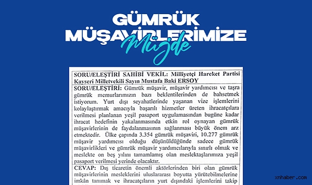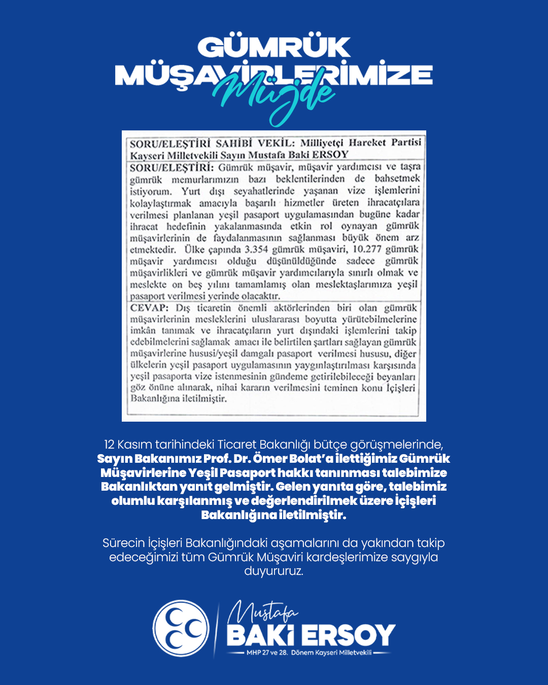 “Gümrük Müşavirlerimizin yeşil pasaport hakkı talebi, Ticaret Bakanlığımız tarafından olumlu karşılanmış ve değerlendirilmek üzere İçişleri Bakanlığına iletilmiştir. Sürecin her aşamasını dikkatle takip etmeye devam edeceğiz. Tüm Gümrük Müşaviri kardeşlerimize hayırlı olmasını temenni ediyorum.”