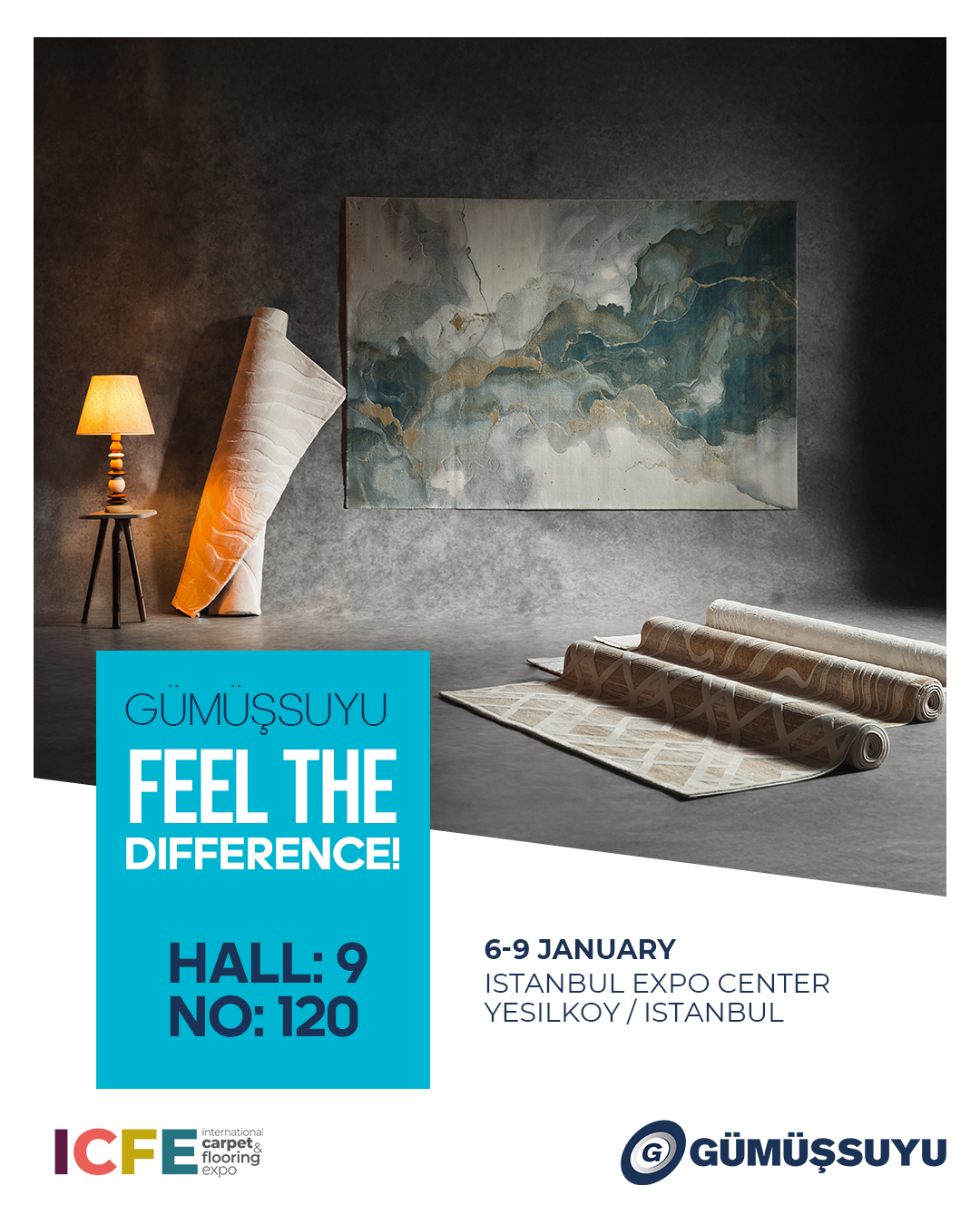 Gümüşsuyu Halı, 6-9 Ocak 2026 tarihleri arasında İstanbul Fuar Merkezi’nde düzenlenecek International Carpet and Flooring Expo 2026’da yer alarak yeni koleksiyonlarını sektör profesyonelleri ve ziyaretçilerin beğenisine sunacak. Firma, fuarda 9. Hall, No:120’deki standında ürünlerini sergileyecek.