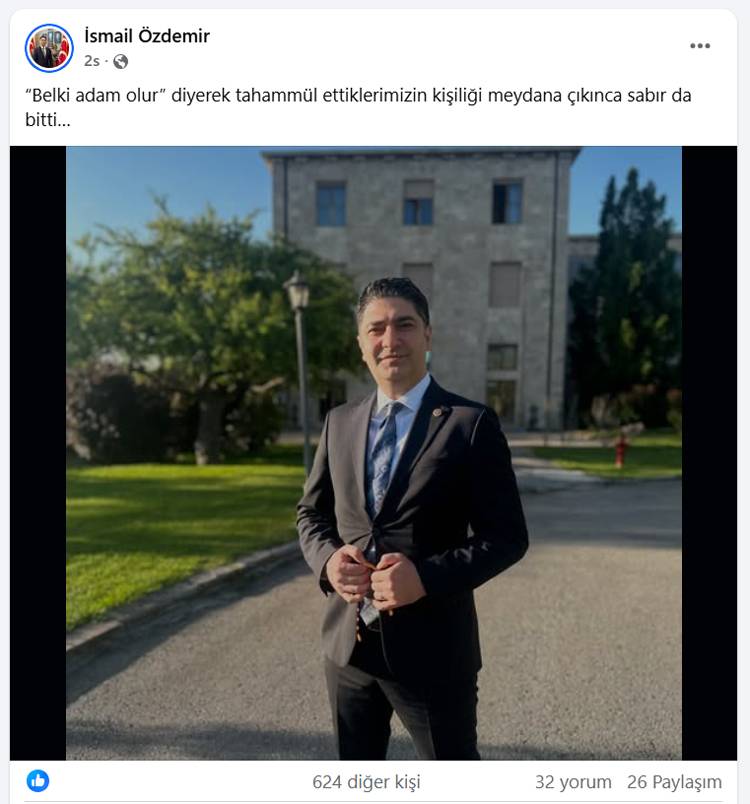 Milliyetçi Hareket Partisi (MHP) Kayseri Milletvekili İsmail Özdemir, sosyal medya hesabından yaptığı paylaşımda dikkat çeken ifadeler kullandı.Özdemir, paylaşımında şu ifadeleri kullandı:“Belki adam olur” diyerek tahammül ettiklerimizin kişiliği meydana çıkınca sabır da bitti…” Milletvekili Özdemir’in bu sözlerle kimi kastettiği merak konusu olurken, paylaşımı kısa sürede çok sayıda yorum ve beğeni aldı. MHP’li ismin mesajının parti içi bir tartışmaya mı, yoksa muhalefete mi yönelik olduğu ise netlik kazanmadı.Kamuoyunda geniş yankı uyandıran paylaşım, sosyal medyada da farklı yorumlara neden oldu.