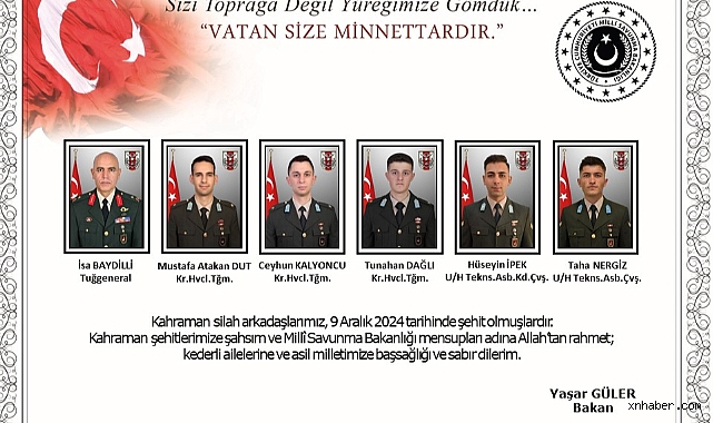 Milli Savunma Bakanı Yaşar Güler, Isparta'da eğitim uçuşu sırasında düşen askeri helikopterde şehit olan 6 asker için taziye mesajı yayımladı. Güler, "Kahraman silah arkadaşlarımız, 9 Aralık 2024 tarihinde şehit olmuştur. Kahraman şehitlerimize şahsım ve Milli Savunma Bakanlığı mensupları adına Allah'tan rahmet; kederli ailelerine ve asil milletimize başsağlığı ve sabır dilerim" dedi.