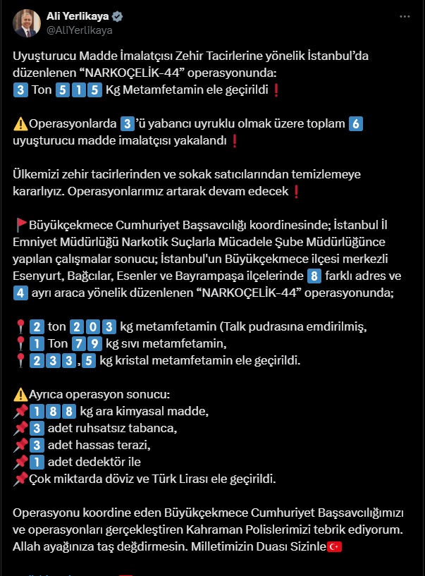 İçişleri Bakanı Ali Yerlikaya, İstanbul’da Narkotik suçlarla mücadele kapsamında gerçekleştirilen ve 'Narkoçelik-44' adı verilen operasyon hakkında bilgi verdi. Sosyal medya hesabından açıklama yapan Yerlikaya, operasyonun Büyükçekmece Cumhuriyet Başsavcılığı'nın koordinasyonunda yürütüldüğünü belirtti.