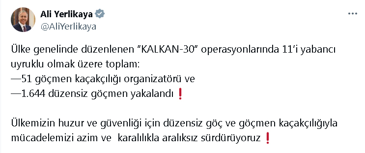 akan Yerlikaya, sosyal medya hesabından yaptığı açıklamada, Cumhuriyet başsavcılıkları ile Göç İdaresi Başkanlığı koordinasyonunda, düzensiz göç ve göçmen kaçakçılığıyla mücadele çalışmaları kapsamında ülke genelinde 'Kalkan-30' operasyonları düzenlendiğini belirtti. Yerlikaya, operasyonlar kapsamında Emniyet Genel Müdürlüğü, Jandarma Genel Komutanlığı ve Sahil Güvenlik Komutanlığı tarafından 24 bin 400 personel ve 7 bin 347 ekibin katılımıyla; 5 bin 94 noktada, 4 bin 241 metruk bina, 7 bin 161 umuma açık yer, 473 terminal ve 2 bin 882 diğer yerler olmak üzere toplam 14 bin 757 yerin denetlendiğini açıkladı. Metruk yerler, umuma açık eğlence mekanları, TIR garajları, terminaller, limanlar, toplu taşıma durak ve istasyonlarında 442 bin 778 kişinin kimlik kontrolünün yapıldığını kaydeden Bakan Yerlikaya, 11'i yabancı uyruklu olmak üzere toplam 51 göçmen kaçakçılığı organizatörü ve 1644 düzensiz göçmenin yakalandığını; ayrıca, 17 otomobil, 3 tekne/bot, 8 ruhsatsız tabanca ve muhtelif miktarda uyuşturucu maddenin ele geçirildiğini bildirdi. Tespit edilen düzensiz göçmenlerin de ülkelerine geri gönderilme işlemlerinin başlatıldığını aktardı.Operasyonlarda birlikte çalışan kamu görevlilerini tebrik eden Yerlikaya, "Ülkemizin huzur ve güvenliği için düzensiz göç ve göçmen kaçakçılığıyla mücadelemizi azim ve karalılıkla aralıksız sürdürüyoruz" dedi.