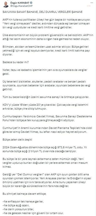 CHP Genel Başkan Yardımcısı Özgür Karabat, "Savunma Sanayii ile İlgili Bazı Düzenlemeler Hakkında Kanun ile Bazı Kanunlarda Değişiklik Yapılmasına Dair Kanun Teklifi”ne ilişkin değerlendirmelerde bulundu.CHP’nin Genel Saymanı ve İstanbul Milletvekili Özgür Karabat, sosyal medya hesabından yaptığı açıklamada, anımsatarak, şunları kaydetti:"Savunma sanayi bahane, deli dumrul vergileri şahane. AKP’nin tutarsız politikaları ülkeyi her gün başka bir noktaya savuruyor. ‘Yeni vergi olmayacak’ dediler, ardından dünyada eşi benzeri olmayan bir vergi uydurdular ve kredi kartı limitine vergi getirdiler. Ülke ekonomisinin en büyük problemi güvensizlik ve belirsizliktir. AKP’nin attığı her adım ekonominin daha kırılgan hale gelmesine neden oluyor. Bilimden, akıldan ve teamüllerden uzak adımlar atılıyor. ‘Bütçe gelirleri yetmediği için ek vergi koyduk’ demiyorlar, ‘kredi kartı limiti katılma payı’ diyorlar. Sadece bu kadar mı? Noter, tapu ve kadastro işlemlerinin yanı sıra oyuncaklara da vergiler geldi. Üç tekerlekli bisikletler, skuterler, pedallı arabalar ve benzeri pedallı oyuncakla oyuncak bebekler için arabalar, oyuncak bebeklere de vergi getirildi. Tüm bu beceriksizliğin üzerini savunma sanayiyle örtmeye çalışıyorlar.