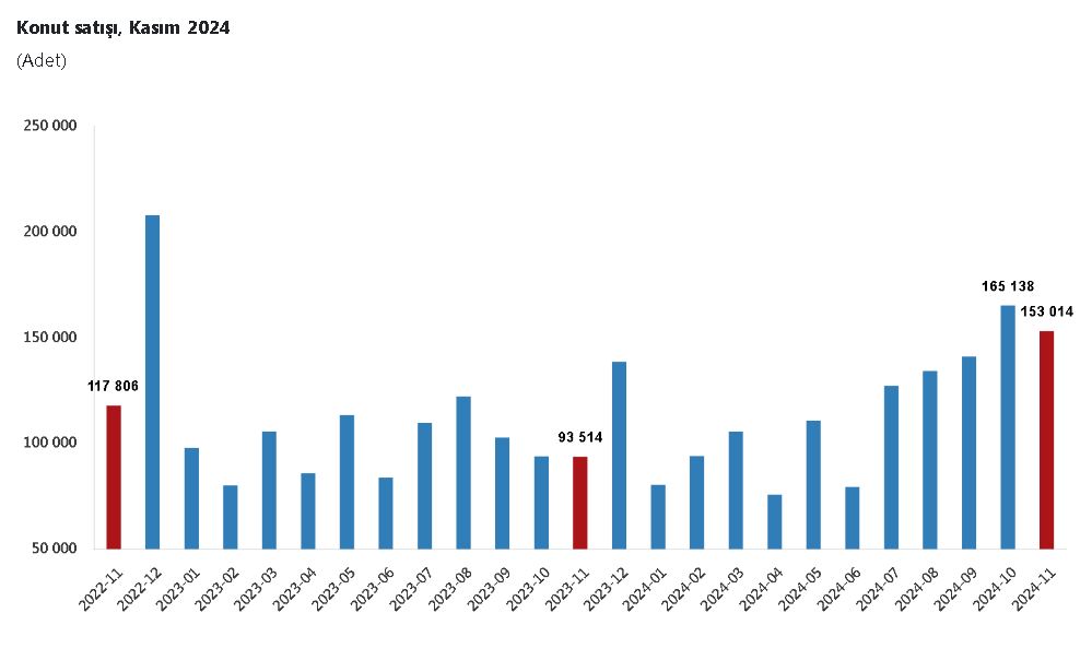 Ocak-Kasım 2024 dönemi verilerine göre, toplam Konut Satışları bir önceki yıla göre yüzde 16,4 oranında artarak 1 milyon 265 bin 388 oldu. Konut satışlarının büyük bir kısmını diğer konut satışları oluşturdu. Kasım ayında diğer konut satışları, bir önceki yılın aynı ayına göre yüzde 48,6 oranında artarak 131 bin 210 oldu ve toplam konut satışları içinde yüzde 85,8'lik bir paya sahip oldu.