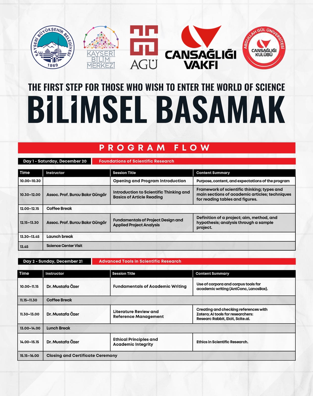Kayseri Bilim Merkezi, 20-21 Aralık 2025 tarihlerinde sağlık alanındaki öğrenci ve profesyonellere özel “Bilimsel Basamak Eğitimi” programına ev sahipliği yapacak. Kayseri Büyükşehir Belediyesi, Abdullah Gül Üniversitesi (AGÜ), Cansağlığı Vakfı ve AGÜ Cansağlığı Kulübü iş birliğiyle gerçekleştirilecek eğitim, bilimsel araştırma ve akademik yazım becerilerini güçlendirmeyi amaçlıyor.