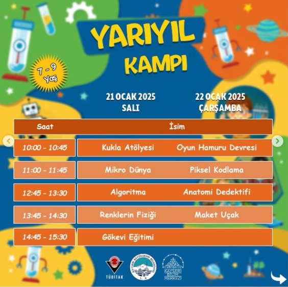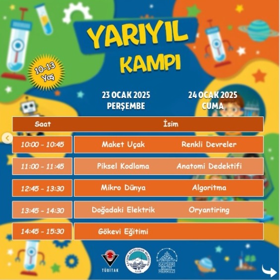 Kayseri Büyükşehir Belediyesi’nin bünyesinde faaliyet gösteren Kayseri Bilim Merkezi, 21-24 Ocak 2025 tarihleri arasında öğrencilere yönelik Yarıyıl Kampı düzenleyecek. Türkiye'deki 6 TÜBİTAK destekli bilim merkezinden biri olan Kayseri Bilim Merkezi, her yıl yaz ve yarıyıl tatillerinde öğrencilere yönelik kamplar düzenleyerek Bilim ve teknolojiye olan ilgiyi artırmayı hedefliyor.Bu yılki Yarıyıl Kampı, 21 Ocak’ta başlayacak ve ikişer günlük 4 farklı kamp programı ile öğrencilere fırsatlar sunacak. Kampın amacı, öğrencilerin yaratıcı düşünme becerilerini geliştirmek, bilimsel kavramları eğlenceli bir şekilde öğretmek ve farklı bilimsel alanlarda uygulamalı eğitimler vermek.