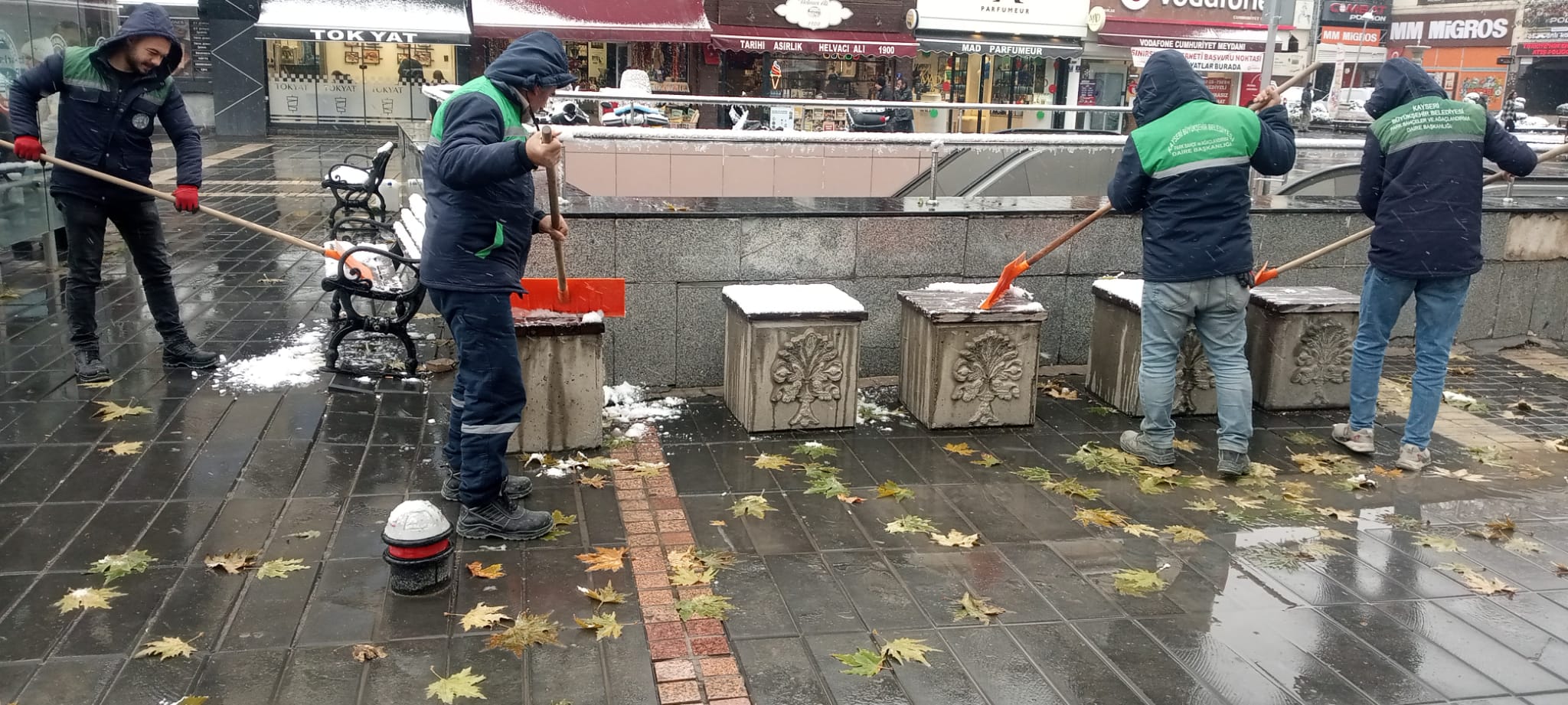 Park ve Bahçeler Daire Başkanlığı’na bağlı ekipler de Cumhuriyet Meydanı, çarşı içi, Hunat bölgesi, balıkçılar önü, millet bahçesi ve çevresi, valilik, Seyyid Burhaneddin Mezarlığı ve çevresi, raylı sistem hattı yaya geçitleri, Erciyes Dağı mıntıka bölgesi ile Mustafa Kemal Paşa Bulvarı yürüyüş yollarında 72 personel ile kar temizliği yapıyor.
