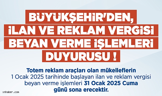 Kayseri Büyükşehir Belediyesi Mali Hizmetler Daire Başkanlığı, totem reklam araçlarına sahip mükellefleri, ilan ve Reklam Vergisi beyanlarını 31 Ocak 2025 tarihine kadar vermeleri konusunda uyardı. Belediye tarafından yapılan duyuruda, 1 Ocak 2025 tarihinde başlayan beyan verme sürecinin son günü olarak 31 Ocak 2025 Cuma günü belirlendi. Mükellefler, beyanlarını zamanında yapmadıkları takdirde gecikme cezası ile karşılaşabilecek.