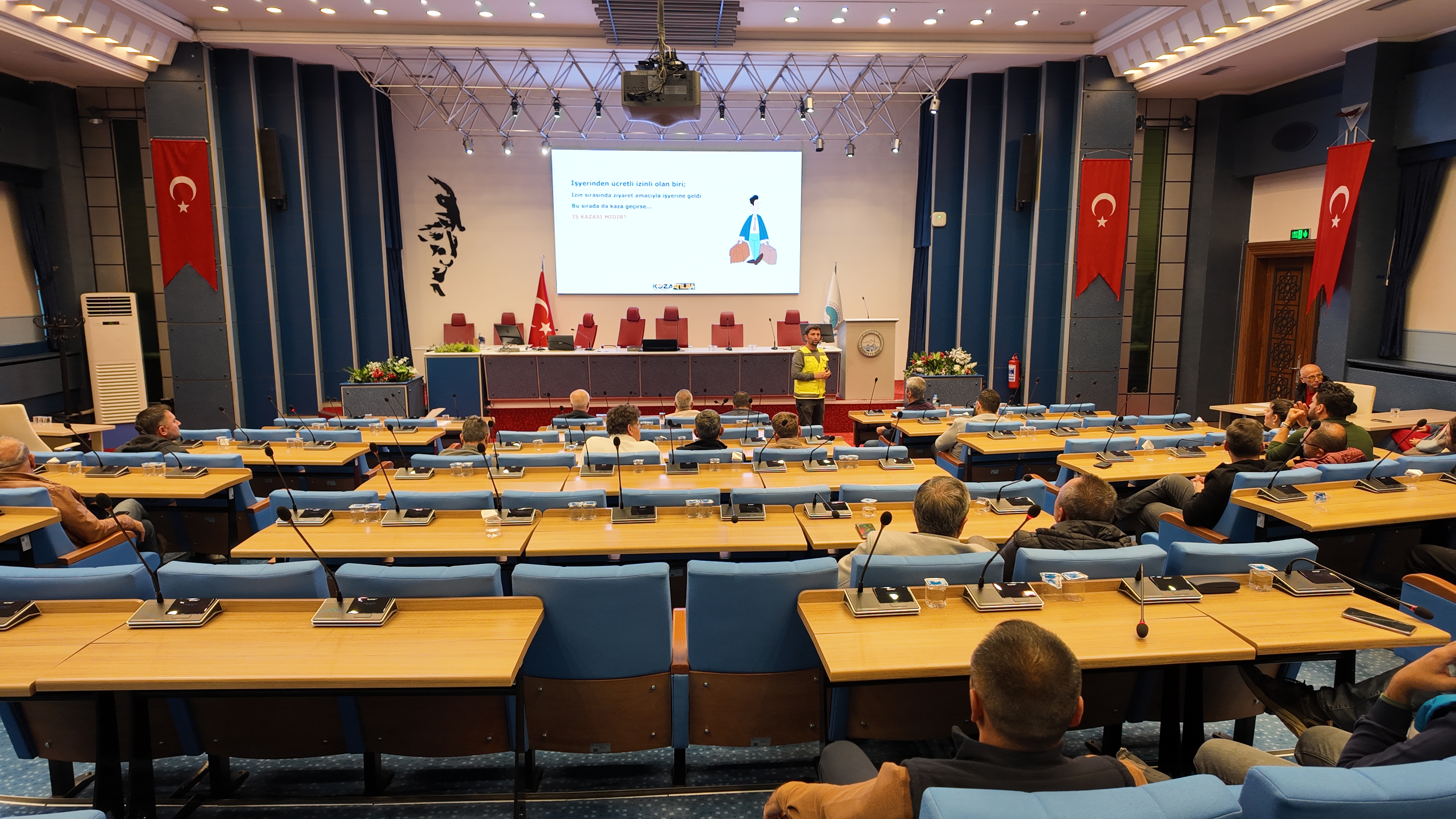 Büyükşehir Belediyesi Sivil Savunma Birimi tarafından Meclis Salonu’nda gerçekleştirilen seminer, personelin iş güvenliği farkındalığını artırmayı hedefledi. Seminer sırasında Başkan Dr. Memduh Büyükkılıç da salonu ziyaret ederek Uzman Erensayın’dan bilgi aldı ve iş sağlığı ile güvenliğinin önemine dikkat çekti.