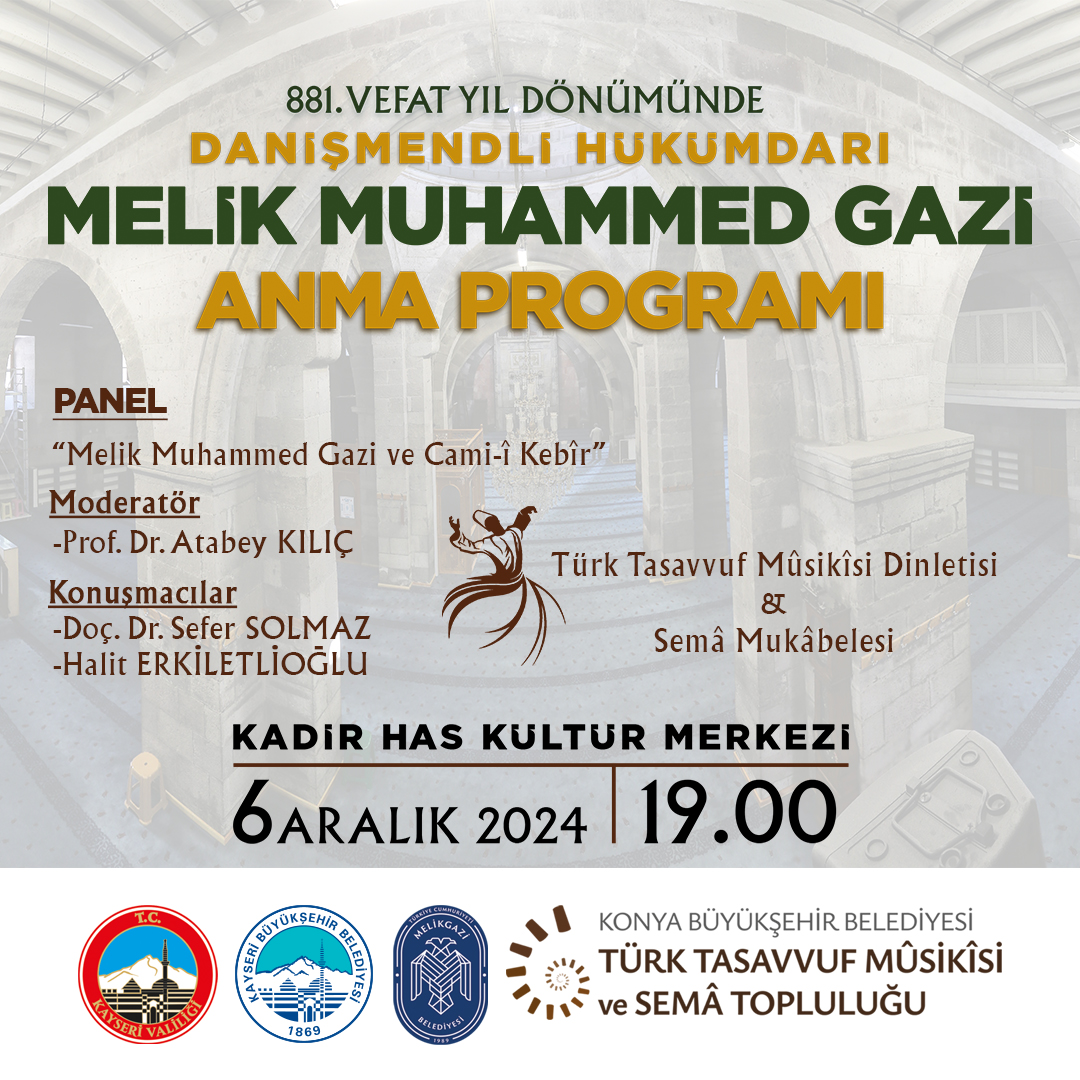 Etkinlik, "Melik Muhammed Gazi ve Cami-i Kebir" başlıklı panelle başlayacak. Panelde, moderatörlüğü Prof. Dr. Atabey Kılıç üstlenirken, konuşmacılar arasında Doç. Dr. Sefer Solmaz ve tarihçi Halit Erkiletlioğlu yer alacak. Panelde Melik Muhammed Gazi’nin tarihi ve manevi kişiliği, Danişmentliler dönemindeki rolü ve Kayseri’nin İslam tarihi açısından önemi tartışılacak.Panelin ardından, Konya Büyükşehir Belediyesi Türk Tasavvuf Musikisi ve Semâ Topluluğu sahne alacak. Tasavvuf Musikisi Dinletisi ve Semâ Mukâbelesi, izleyicilere manevi bir atmosfer sunarak unutulmaz bir gece yaşatacak.Kayseri Valiliği, Melikgazi Belediyesi ve Konya Büyükşehir Belediyesi iş birliğiyle gerçekleşecek olan bu etkinlik, hem tarihi bir hatırlatma hem de kültürel bir buluşma olarak öne çıkıyor.Kayseri halkını bu anlamlı programa davet eden Başkan Büyükkılıç, “Şehrimizin değerlerine sahip çıkmak adına düzenlenen bu geceye tüm hemşehrilerimizi bekliyoruz,” diyerek herkesi Kadir Has Kültür Merkezi'ne çağırdı.