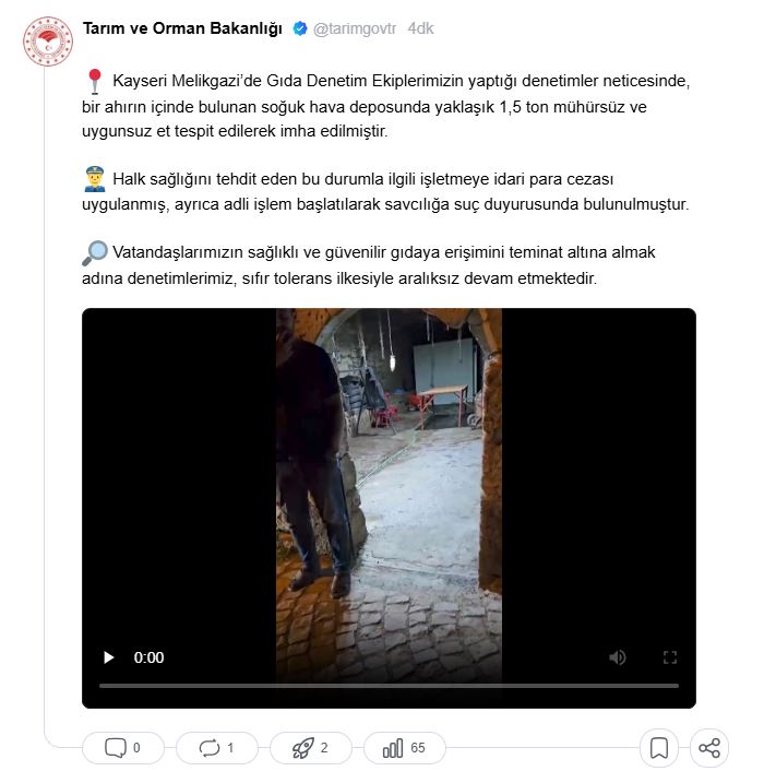 Bakanlık yetkilileri tarafından yapılan açıklamada, “Kayseri Melikgazi’de Gıda Denetim Ekiplerimizin yaptığı denetimler neticesinde, bir ahırın içinde bulunan soğuk hava deposunda yaklaşık 1,5 ton mühürsüz ve uygunsuz et tespit edilerek imha edilmiştir. Halk sağlığını tehdit eden bu durumla ilgili işletmeye idari para cezası uygulanmış, ayrıca adli işlem başlatılarak savcılığa suç duyurusunda bulunulmuştur. Vatandaşlarımızın sağlıklı ve güvenilir gıdaya erişimini teminat altına almak adına denetimlerimiz, sıfır tolerans ilkesiyle aralıksız devam etmektedir” ifadelerine yer verildi.