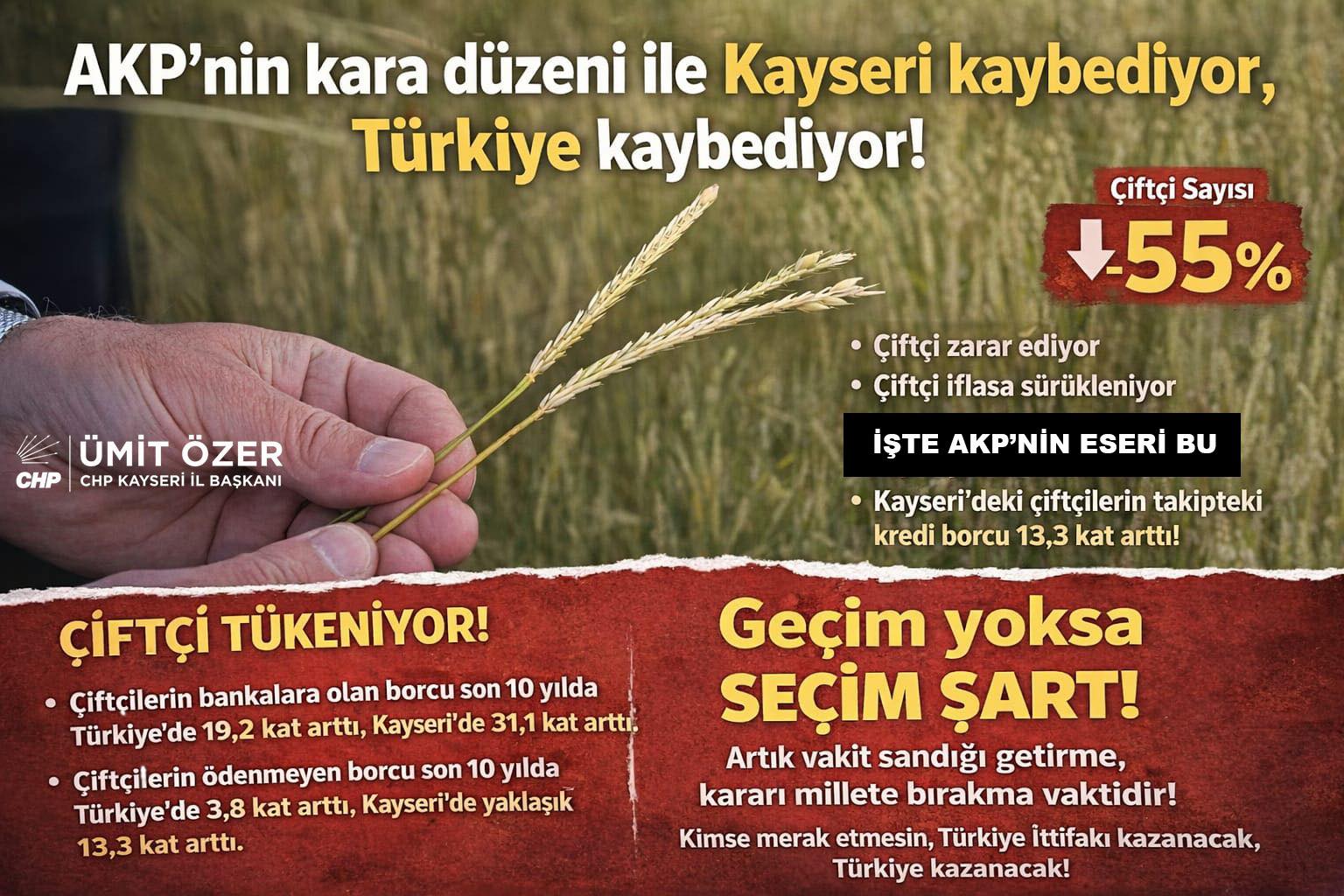 CHP Kayseri İl Başkanı Ümit Özer, yaptığı yazılı açıklamada AKP’nin uzun yıllardır sürdürdüğü politikalar nedeniyle Kayseri’de ve Türkiye genelinde tarımın gerilediğini belirtti. Özer, Kayseri’nin iktidara en fazla destek veren illerden biri olmasına rağmen hak ettiği yatırımı ve karşılığı alamadığını ifade etti.
