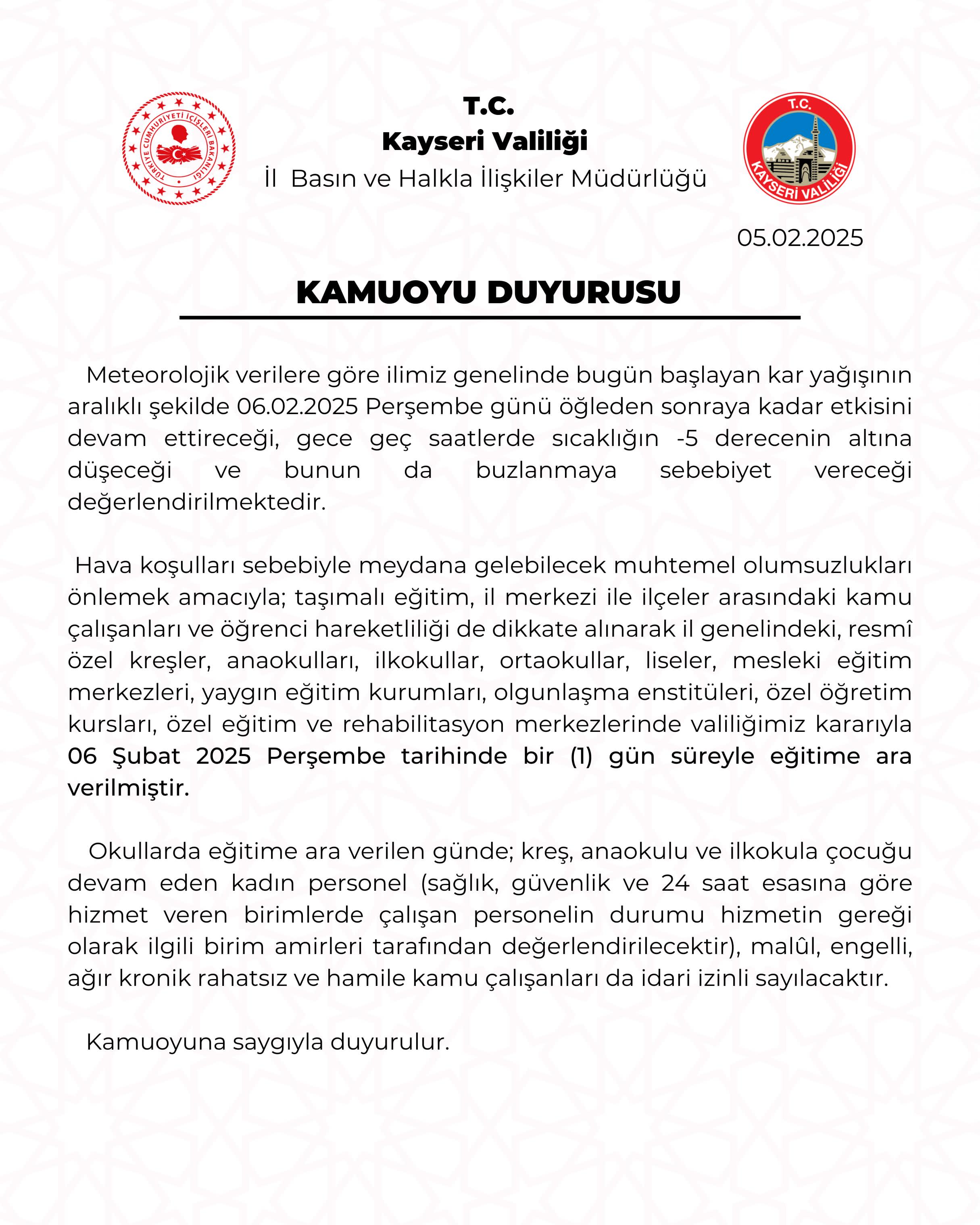 Kayseri Valiliği, 06.02.2025 günü il merkezi ve tüm ilçelerde eğitim ve öğretime 1 gün ara verileceğini açıkladı. Valilik tarafından yapılan duyuruda, eğitim ve öğretim faaliyetlerine ara verilmesi kararının alındığı belirtildi.