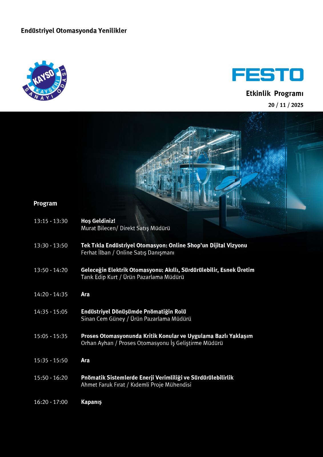 Kayseri Sanayi Odası (KAYSO), endüstriyel üretimde dönüşümün nabzını tutacak önemli bir etkinliğe ev sahipliği yapıyor. KAYSO ile otomasyon teknolojilerinde dünya liderlerinden FESTO’nun ortaklaşa düzenlediği “Endüstriyel Otomasyonda Yenilikler” başlıklı bilgilendirme toplantısı, 20 Kasım 2025 Perşembe günü sanayicilerle buluşuyor.KAYSO Konferans Salonu’nda 13.15’te başlayacak programda, endüstriyel otomasyonun farklı alanlarına yönelik kapsamlı sunumlar gerçekleştirilecek. Açılış konuşmasının ardından katılımcılar; dijital satış vizyonundan akıllı, sürdürülebilir ve esnek üretim modellerine, pnömatik sistemlerin geleceğinden proses otomasyonundaki kritik uygulamalara kadar birçok başlıkta güncel bilgiler edinecek.Toplantıda özellikle elektrik otomasyonunun geleceği, enerji verimliliği, sürdürülebilir üretim, proses yönetiminde yenilikçi yaklaşımlar ve endüstriyel dönüşümde pnömatiğin rolü öne çıkacak. FESTO uzmanlarının sahadaki deneyimlerine dayalı aktaracağı bilgiler, Kayseri sanayisinde üretim kalitesini artırmayı hedefliyor.KAYSO, tüm üyelerini ve otomasyon alanına ilgi duyan tüm sektör temsilcilerini etkinliğe davet ediyor.Tarih: 20 Kasım 2025 Perşembe