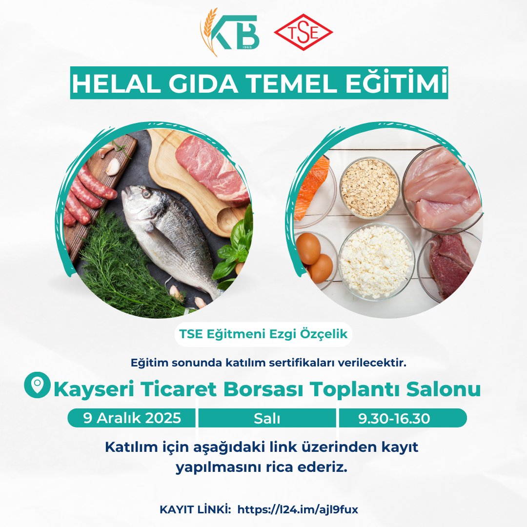 Helal gıda üretim ve denetim standartlarını öğrenmek isteyenler için önemli bir fırsat Kayseri’de sunuluyor. Türk Standardları Enstitüsü (TSE) tarafından düzenlenen “Helal Gıda Temel Eğitimi”, alanında deneyimli eğitmen Ezgi Özçelik tarafından verilecek.