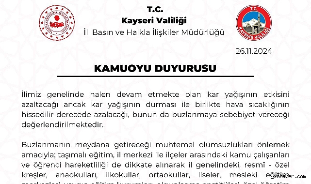 Kayseri Valiliği, 27 Kasım Çarşamba günü il merkezi ve tüm ilçelerde eğitim ve öğretime 1 gün daha ara verileceğini açıkladı. Valilik tarafından yapılan duyuruda, eğitim ve öğretim faaliyetlerine ara verilmesi kararının alındığı belirtildi.