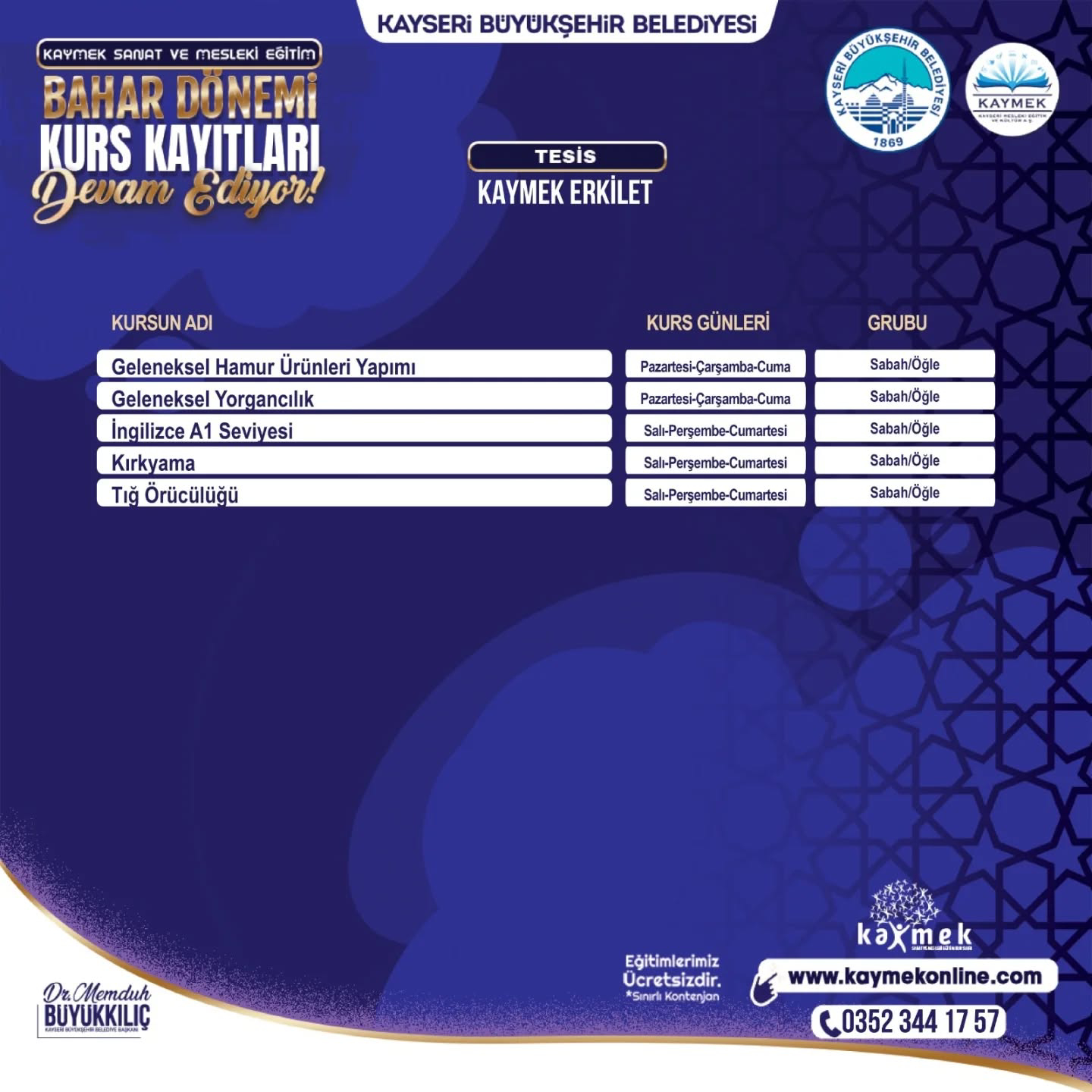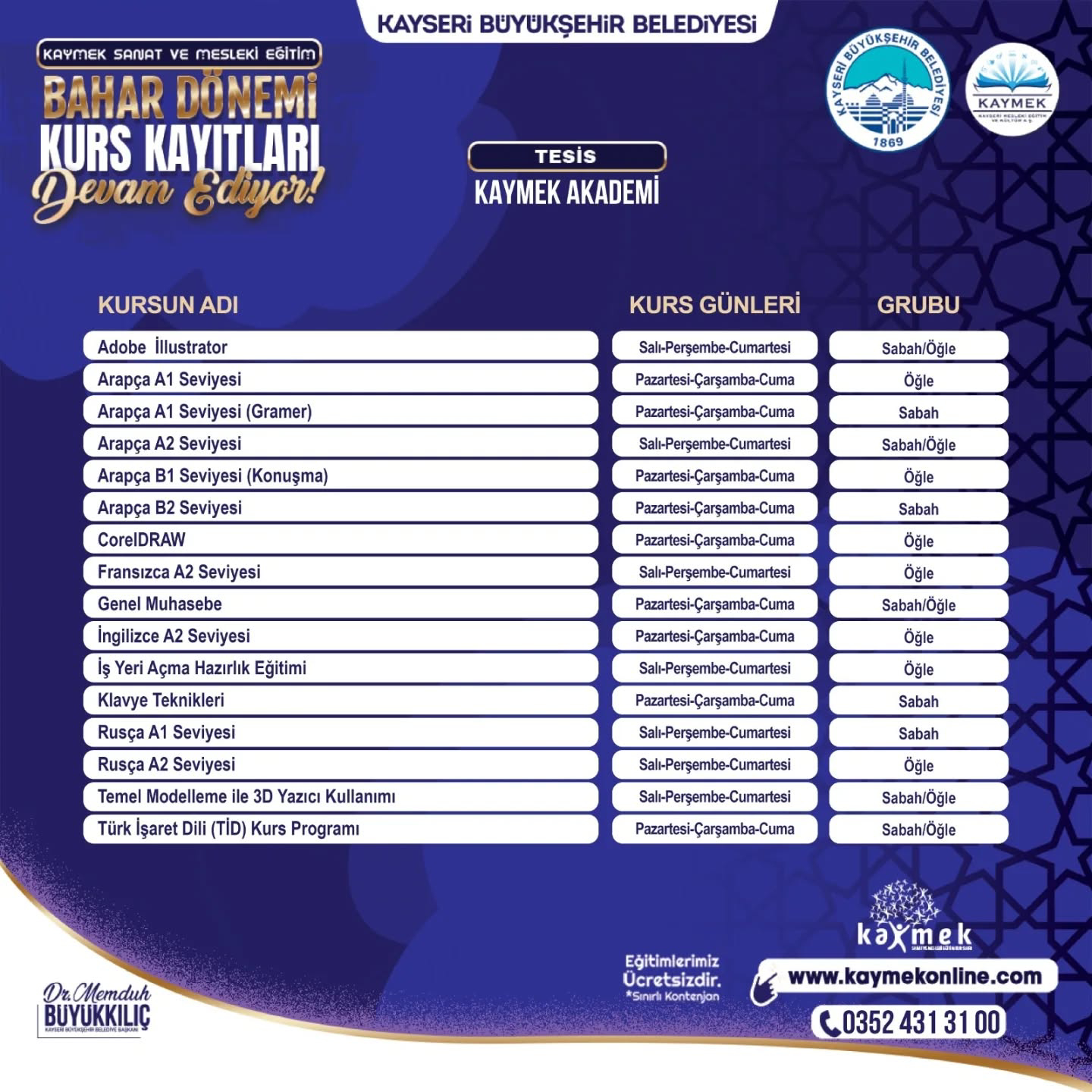 KAYMEK, alanında uzman eğitmenler eşliğinde tamamen ücretsiz olarak sunulan kurslarla sanat, kültür ve mesleki eğitim alanında vatandaşlara geniş fırsatlar sunuyor. Kontenjanlar sınırlı olduğu için kayıt yaptırmak isteyenler www.kaymekonline.com adresinden veya 0 352 231 80 31 numaralı telefondan detaylı bilgi alabilir.